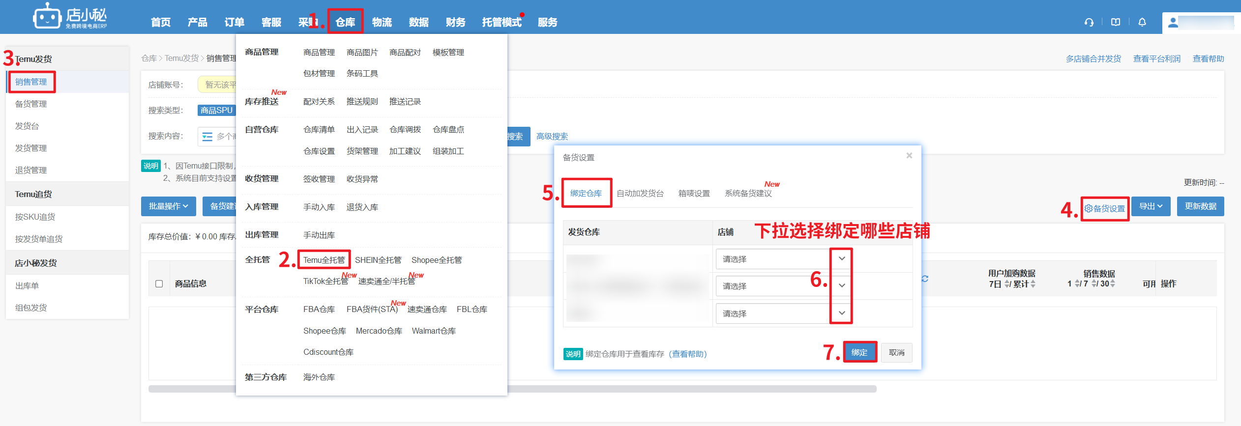 第一步:【仓库—Temu全托管—销售管理—备货设置—绑定仓库—下拉选择仓库要与哪个Temu店铺进行绑定—确定即可】
