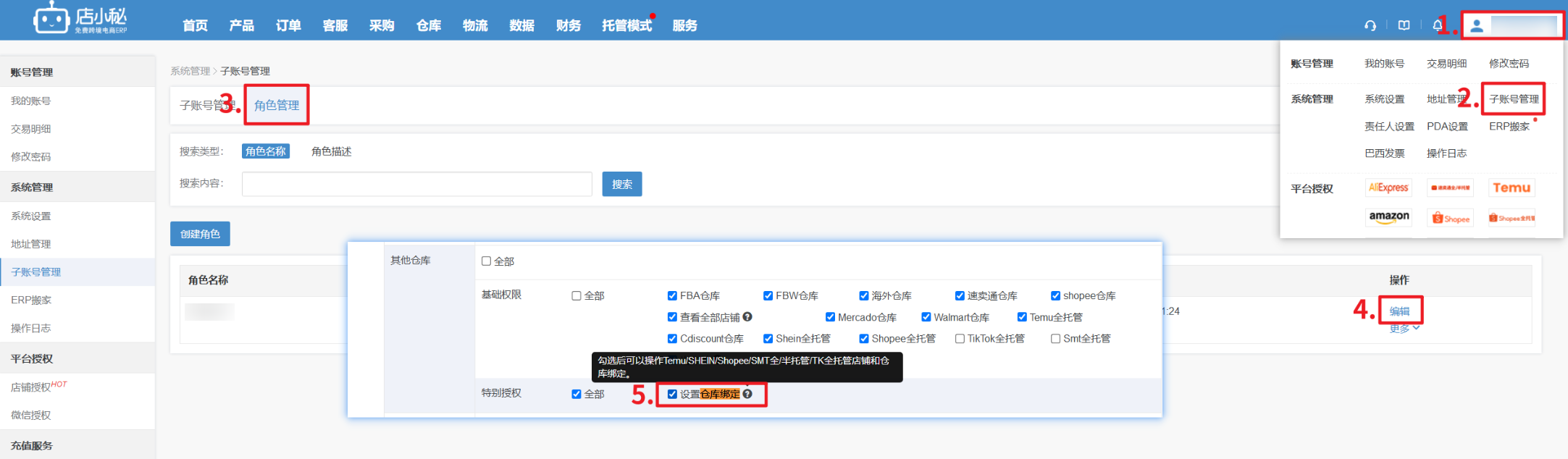A1:【登录店小秘主账号—用户名—子账号管理—角色管理—编辑—仓库模块,勾选设置仓库绑定按钮】即可