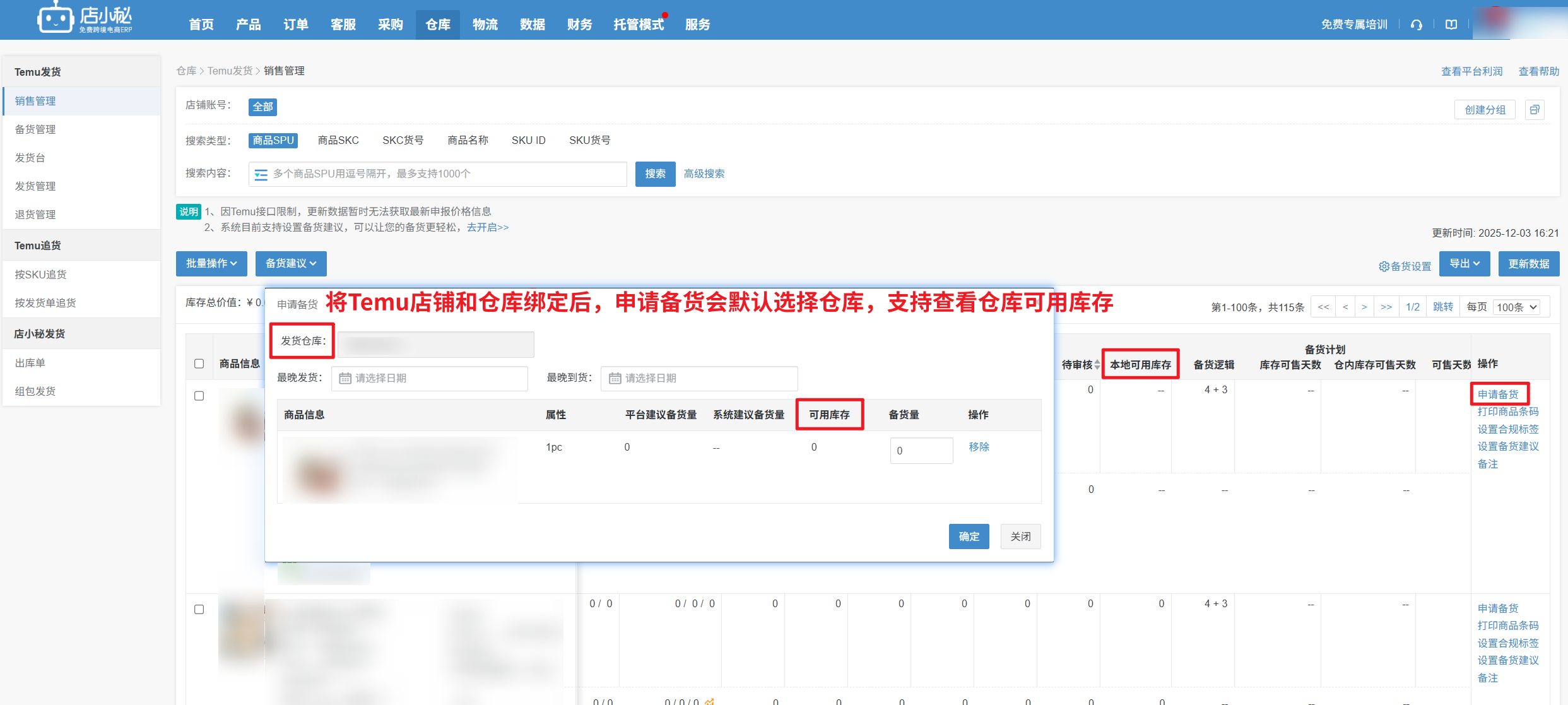 定义:将速卖通全/半托管/Temu/Shein/Shopee/TikTok全托管店铺和小秘仓库进行绑定,方便按剩余库存生成备货单