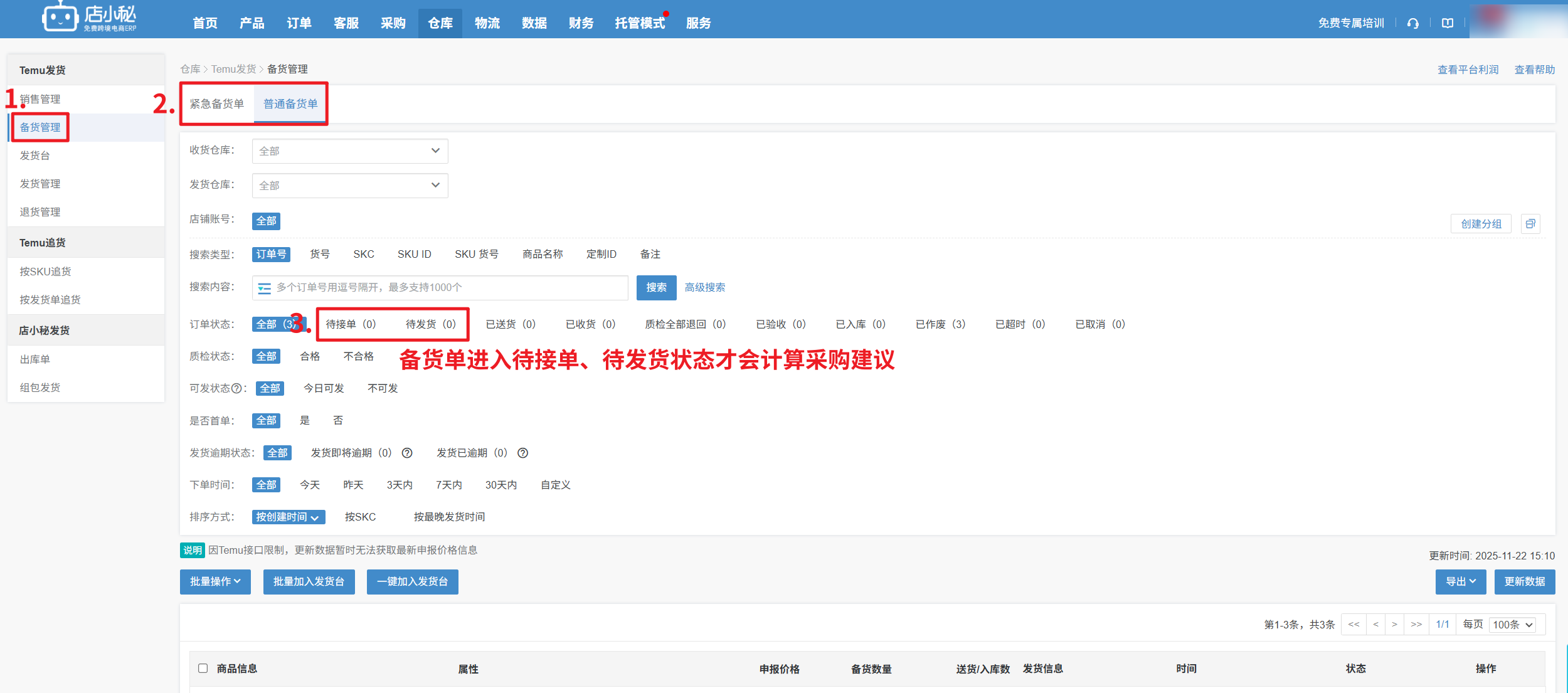同时备货单进入待接单/待发货状态,也会计算订单量,会计算采购建议,方便采购