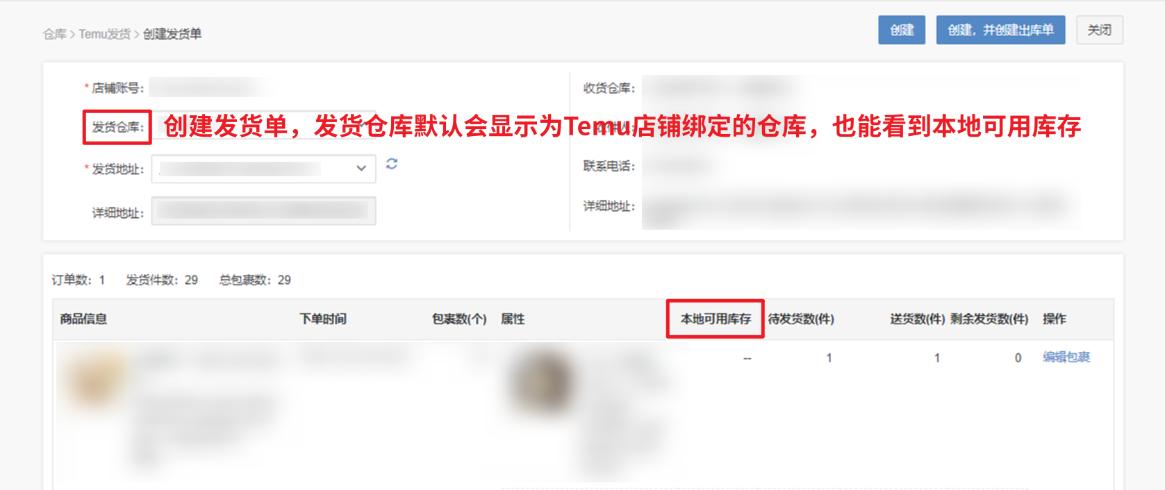 加入发货台后,创建发货单,默认显示绑定仓库,显示本地可用库存