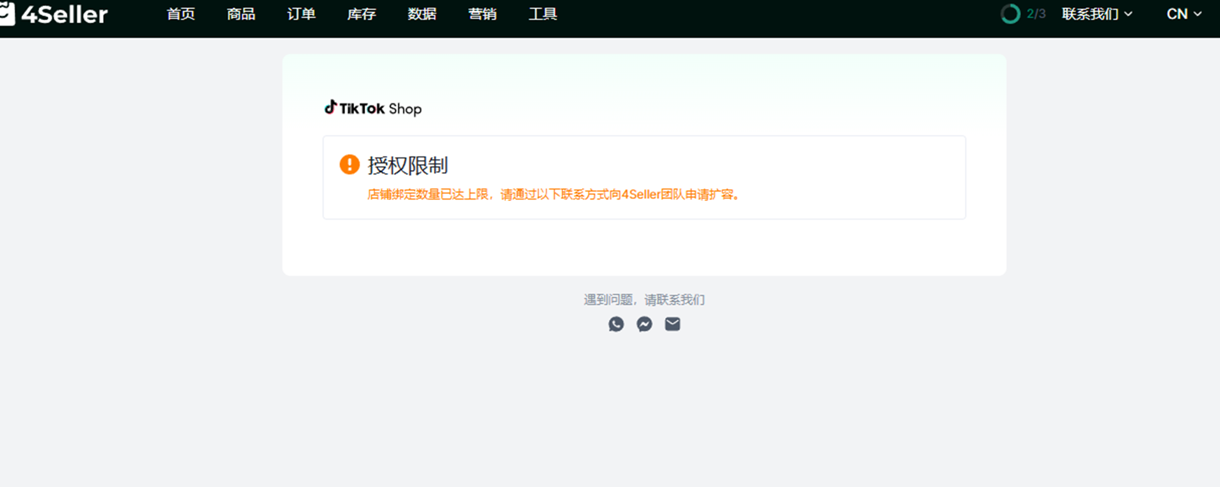 Q5:添加新的美国本土Tiktok店铺授权,提示店铺绑定数量已达上限,请通过以下联系方式向4Seller团队申请扩容