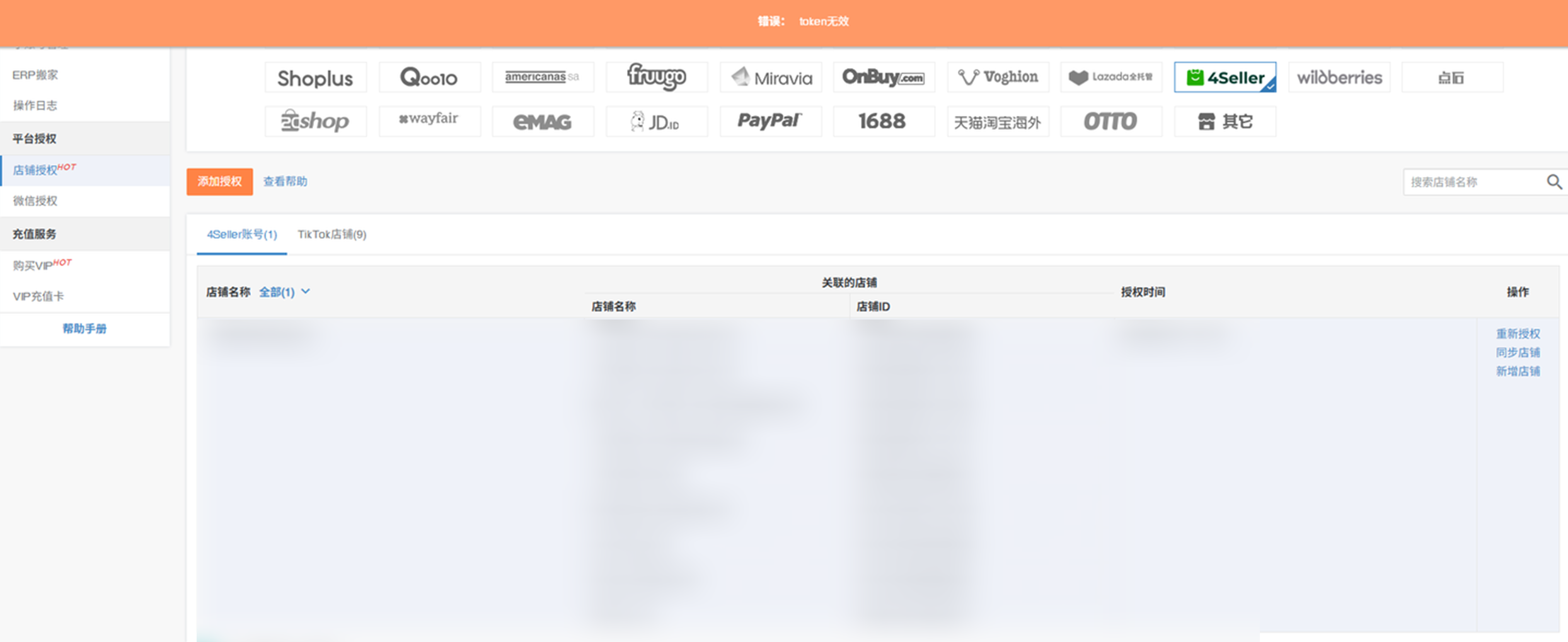 A5:这是您的4seller账号授权异常了,点重新授权,重新授权下4seller账号再去新增店铺