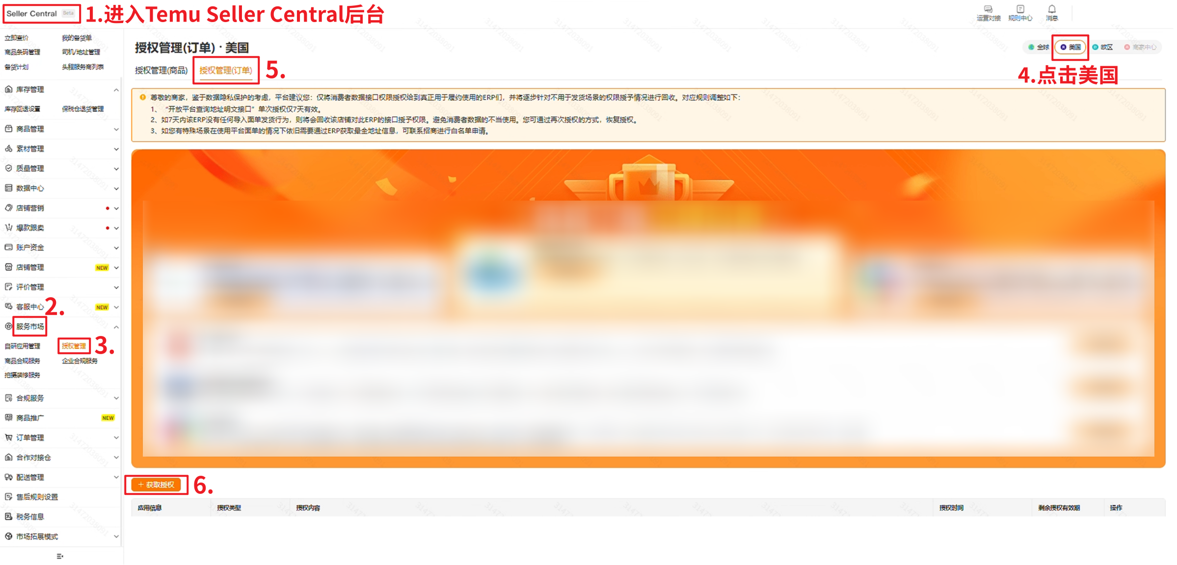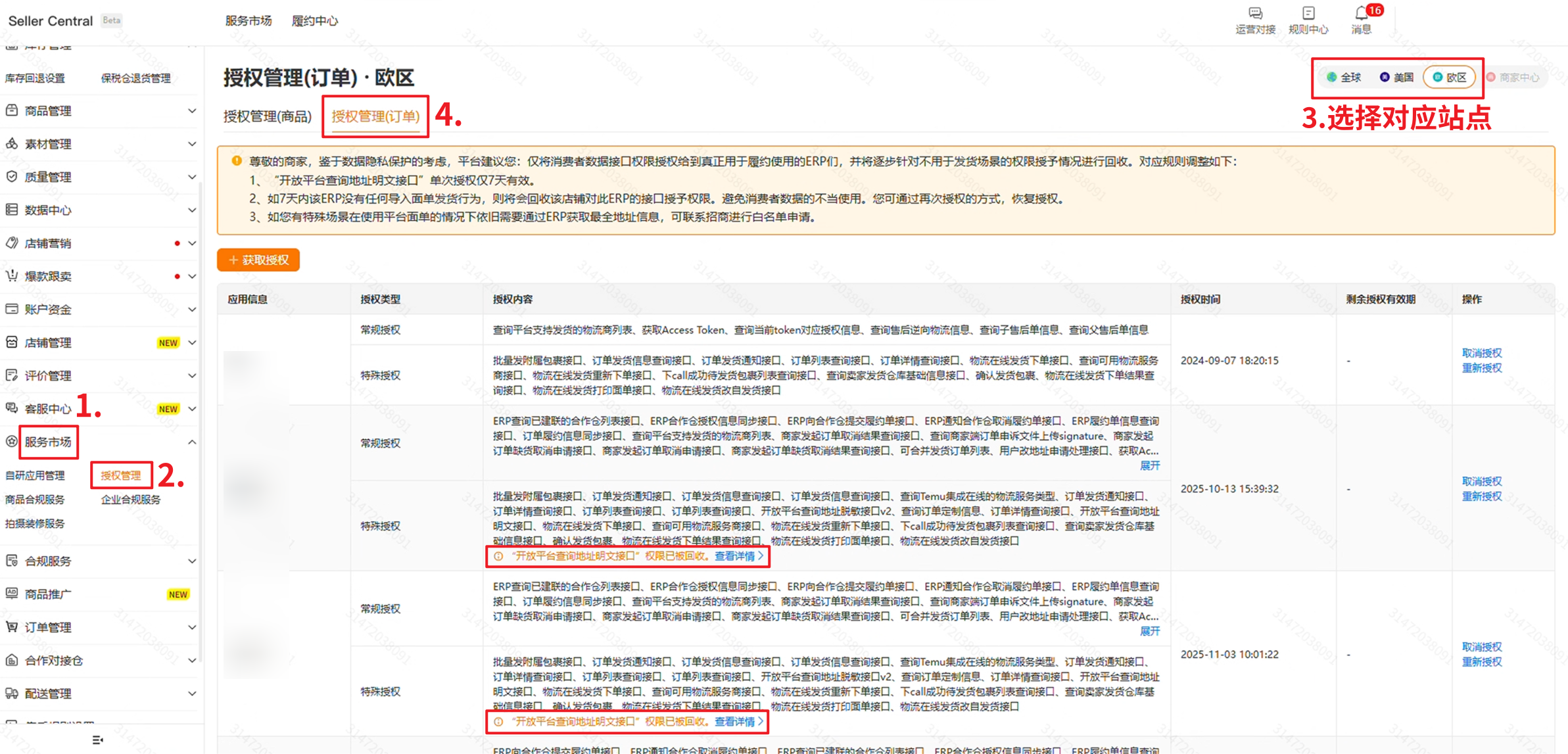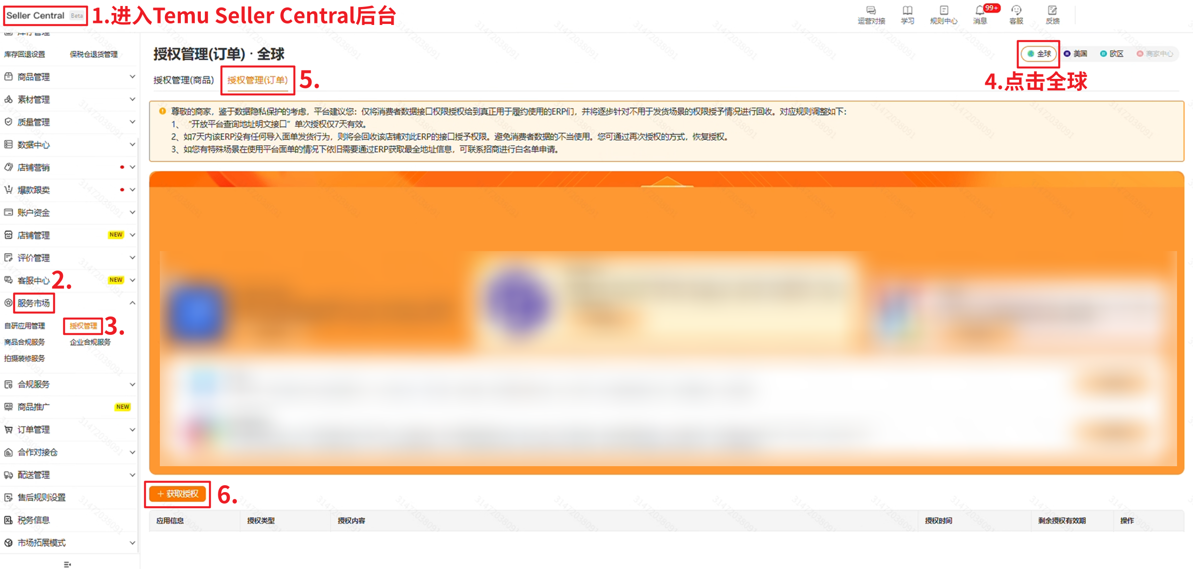 【Temu后台—服务市场—授权管理—右上角选择对应站点:全球/美国/欧区—授权管理(订单)—获取订单发货Token】