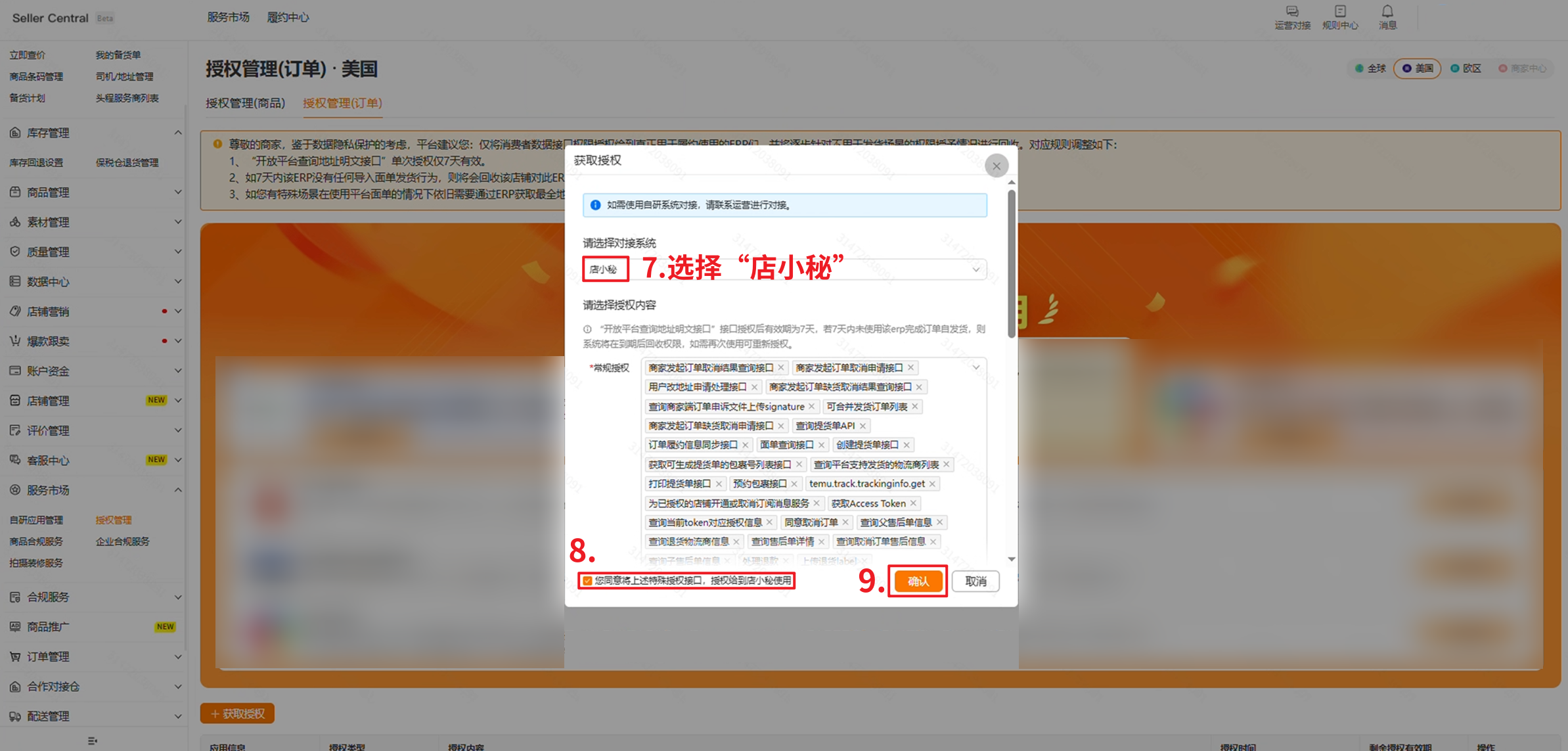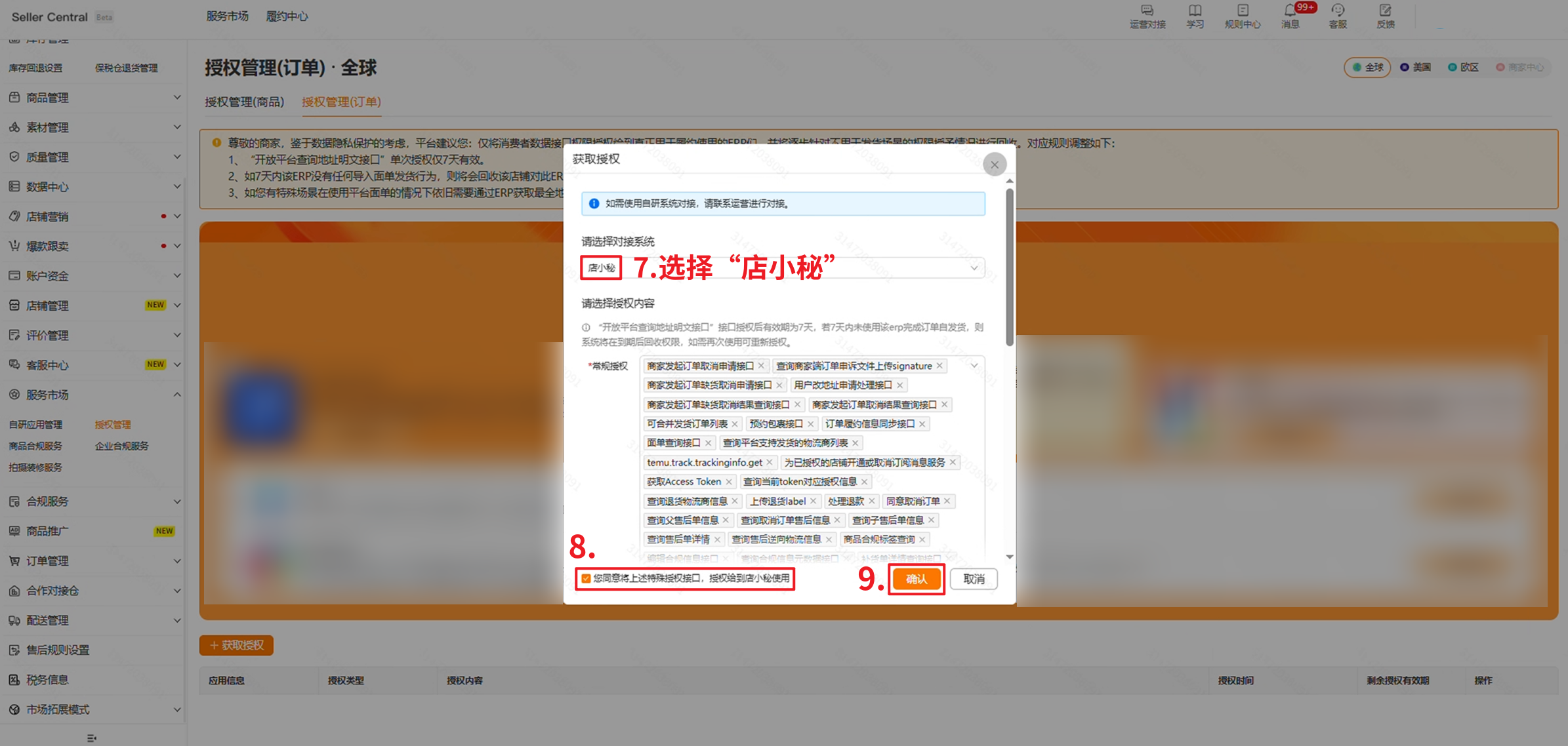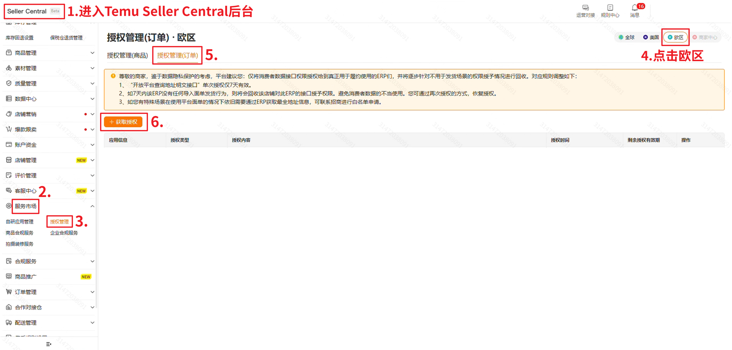【Temu后台—服务市场—授权管理—右上角选择对应站点:全球/美国/欧区—授权管理(订单)—获取订单发货Token】