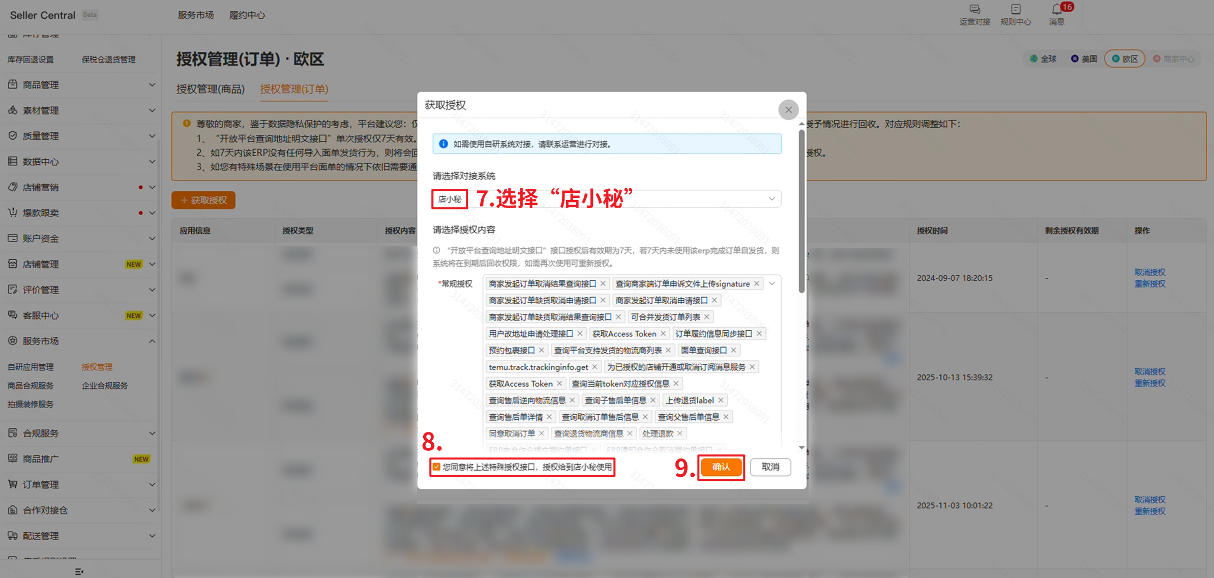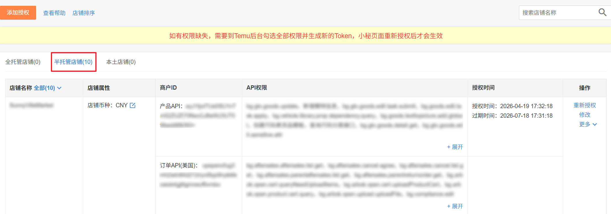 以上两种情况Temu平台都会回收订单API Token权限,可以到Temu后台授权管理查看平台提示