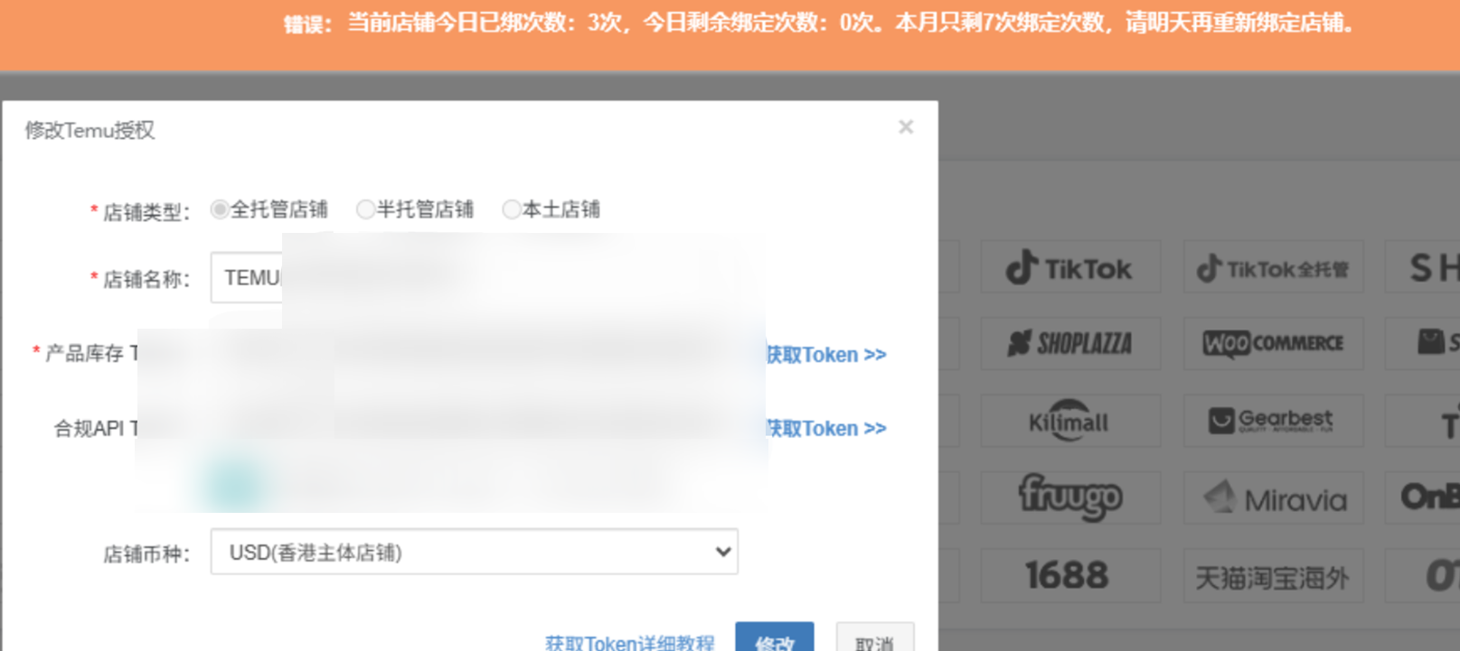 Q2:Temu半托管授权报错:今日剩余绑定次数:0次?