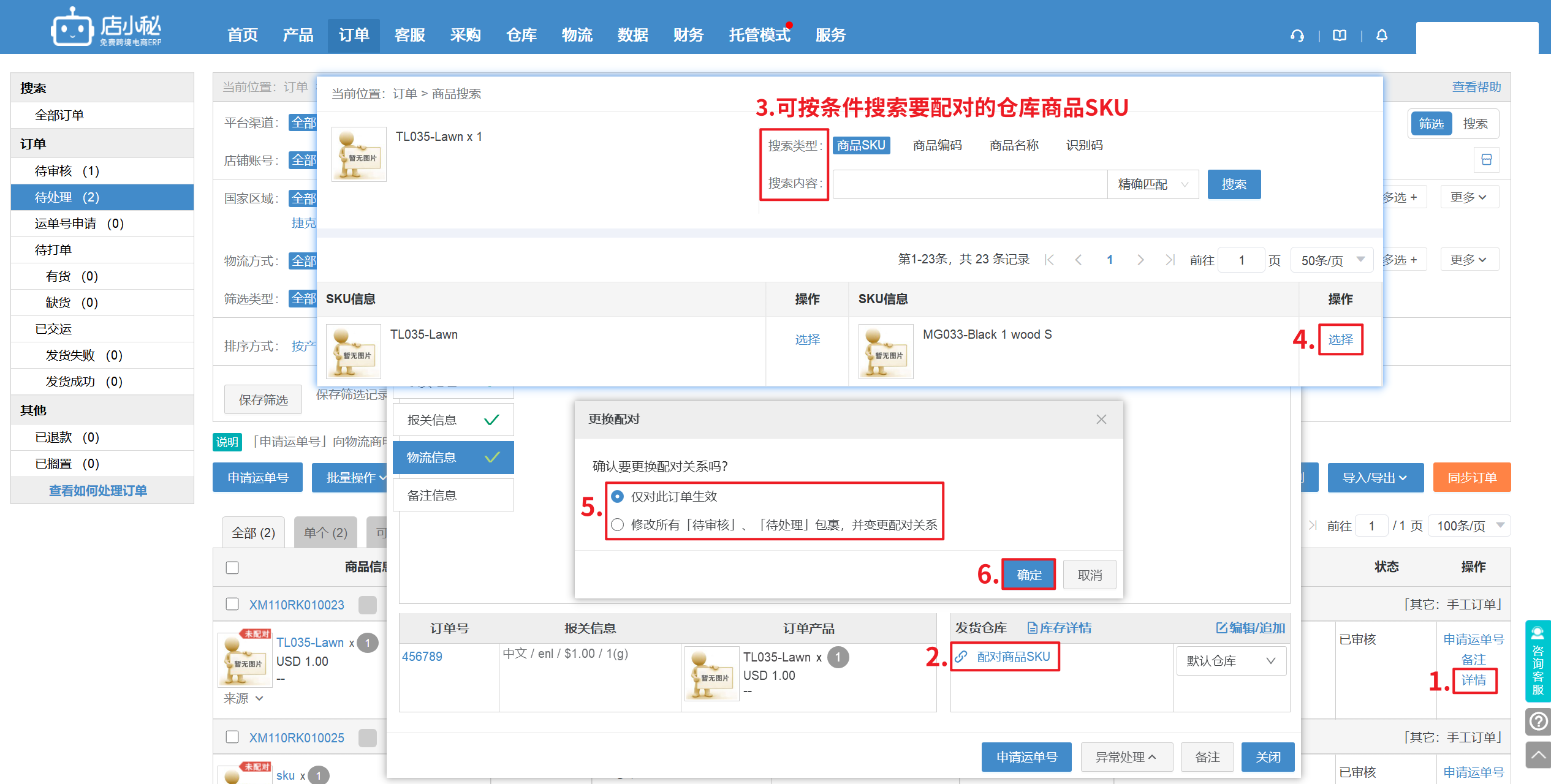 步骤:【订单详情—点击配对—选择已经和MCS产品SKU配对过的商品SKU—选择仅对此订单生效或所有「待审核」「待处理」包裹生效】