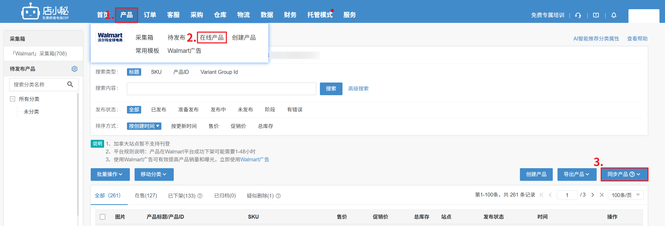 步骤一:【产品—Walmart在线产品—同步产品】