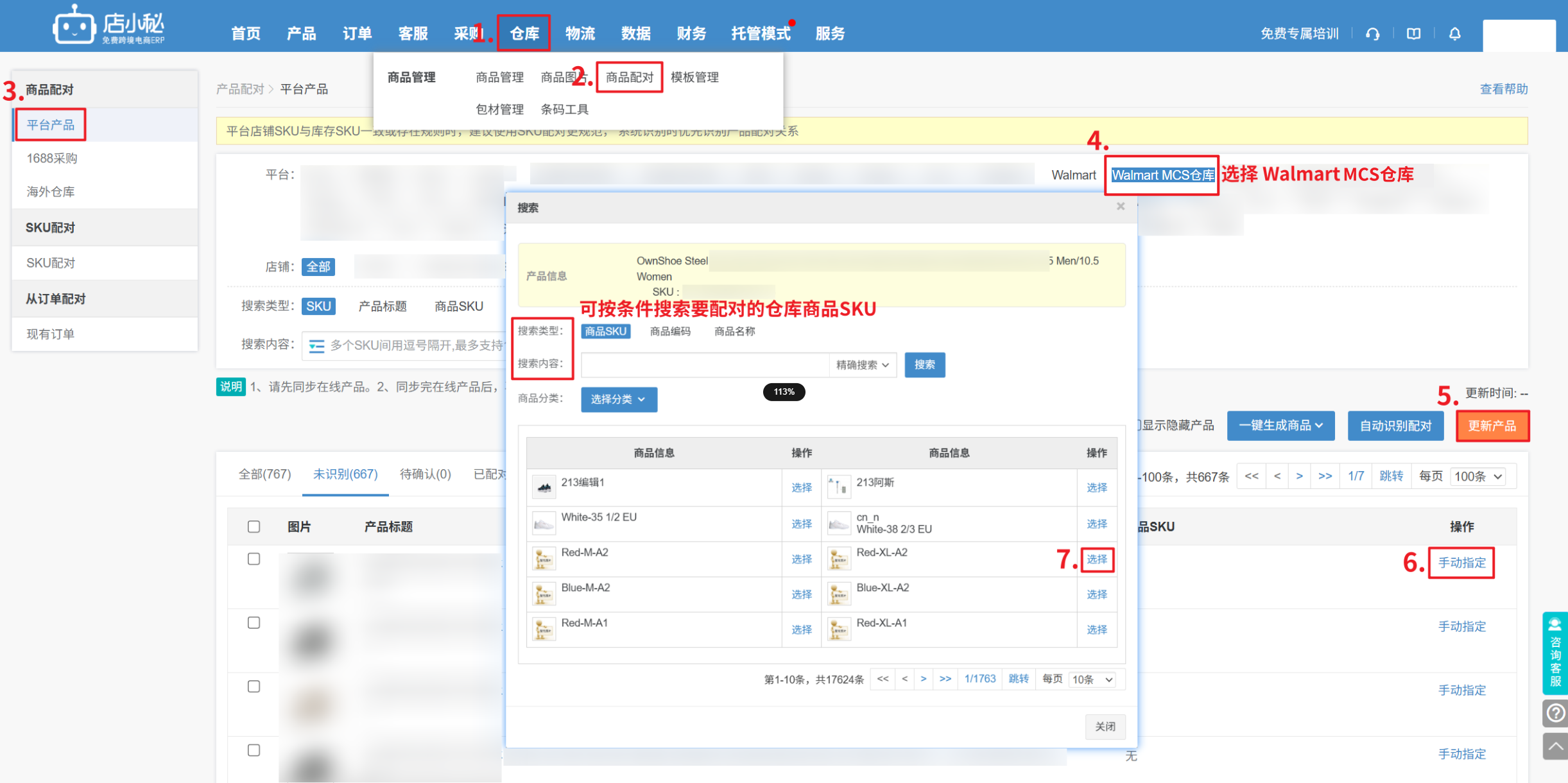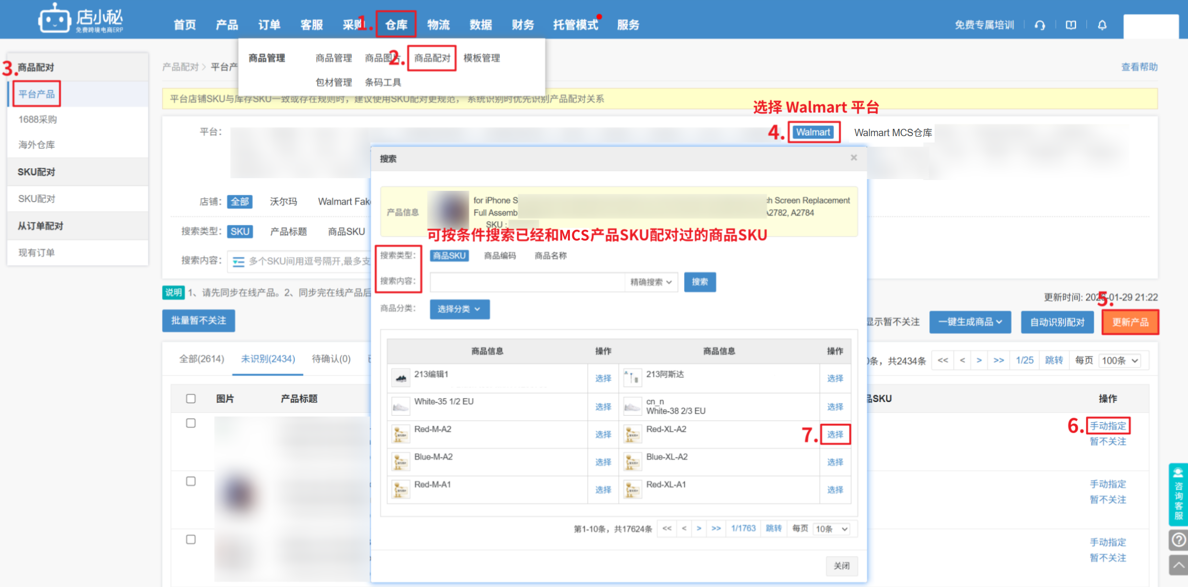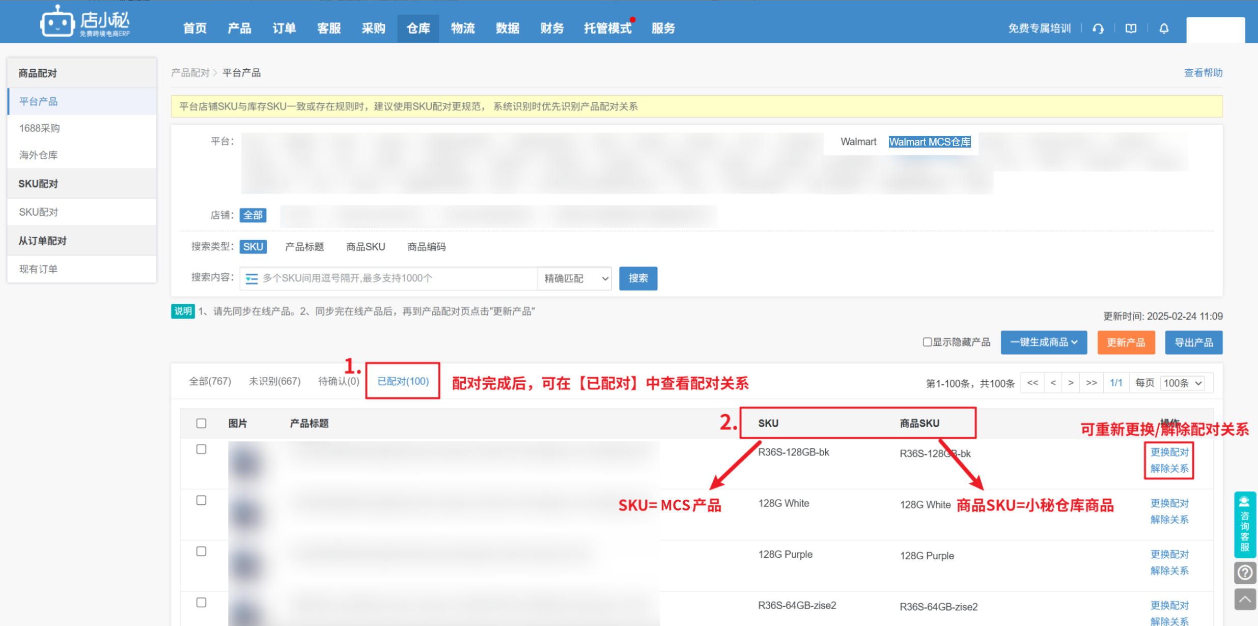 步骤:【仓库—商品配对—平台产品—Walmart—更新产品,将店铺产品SKU同步过来,指定选择和MCS产品SKU配对过的商品SKU完成配对】