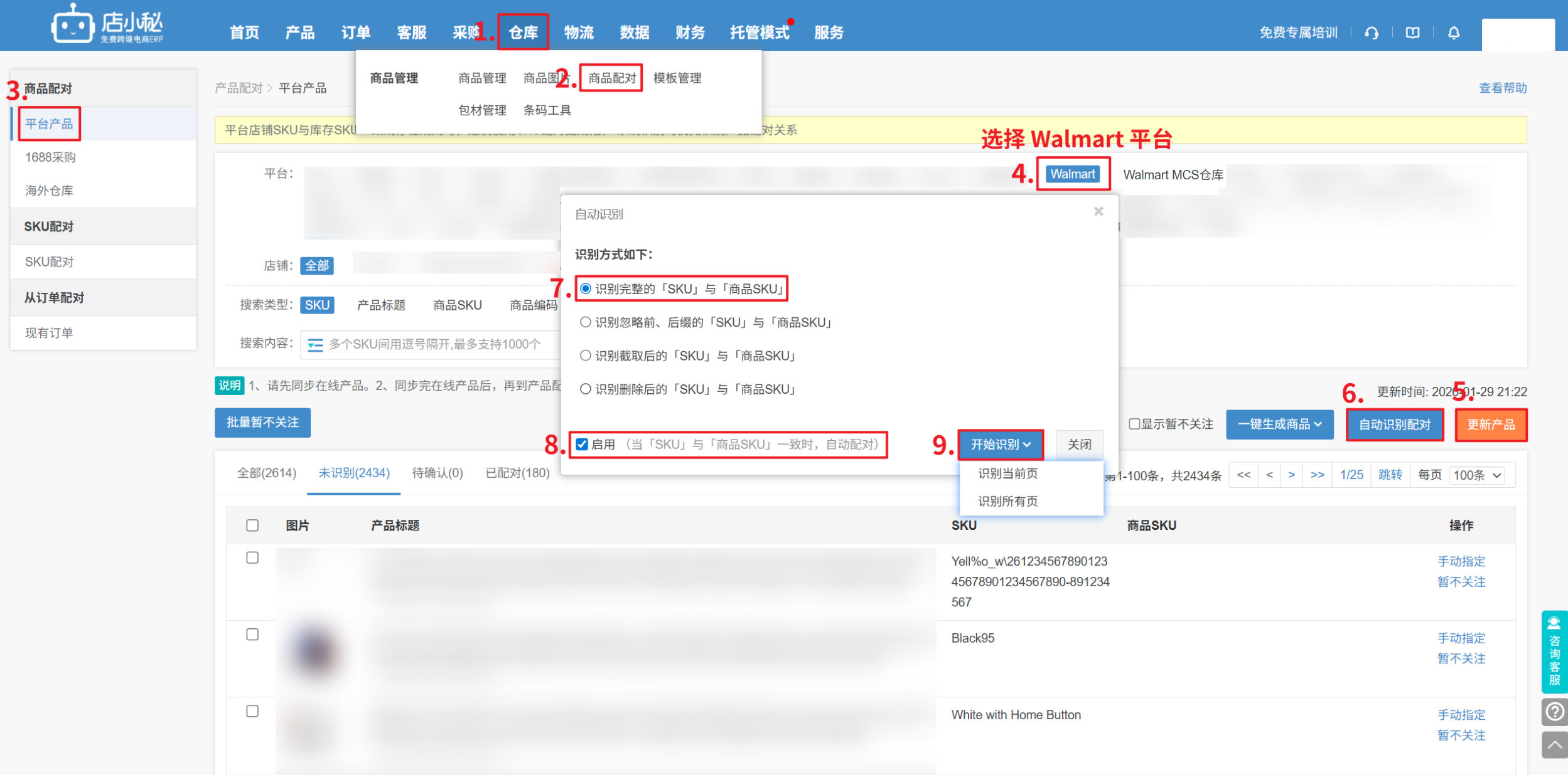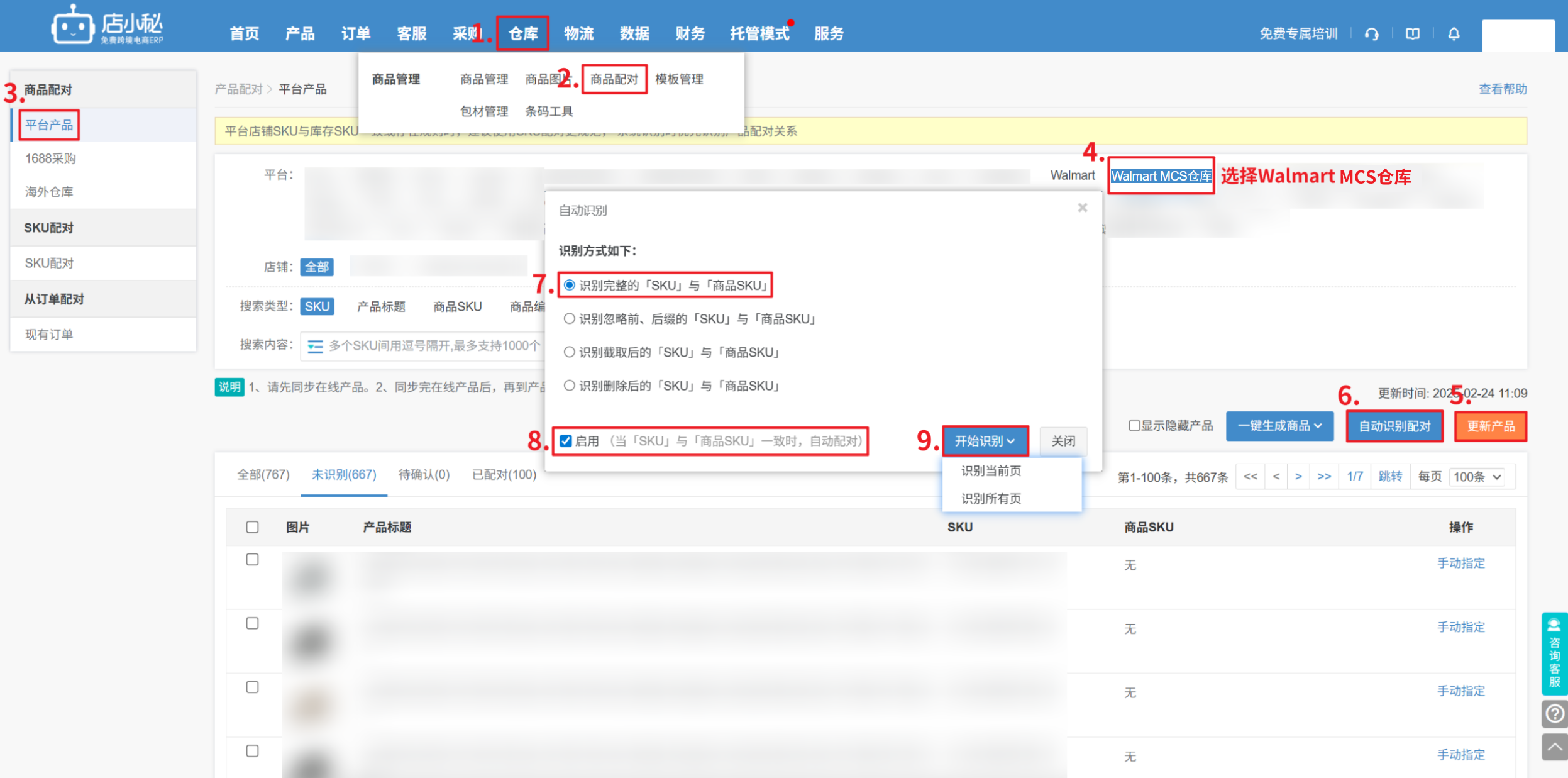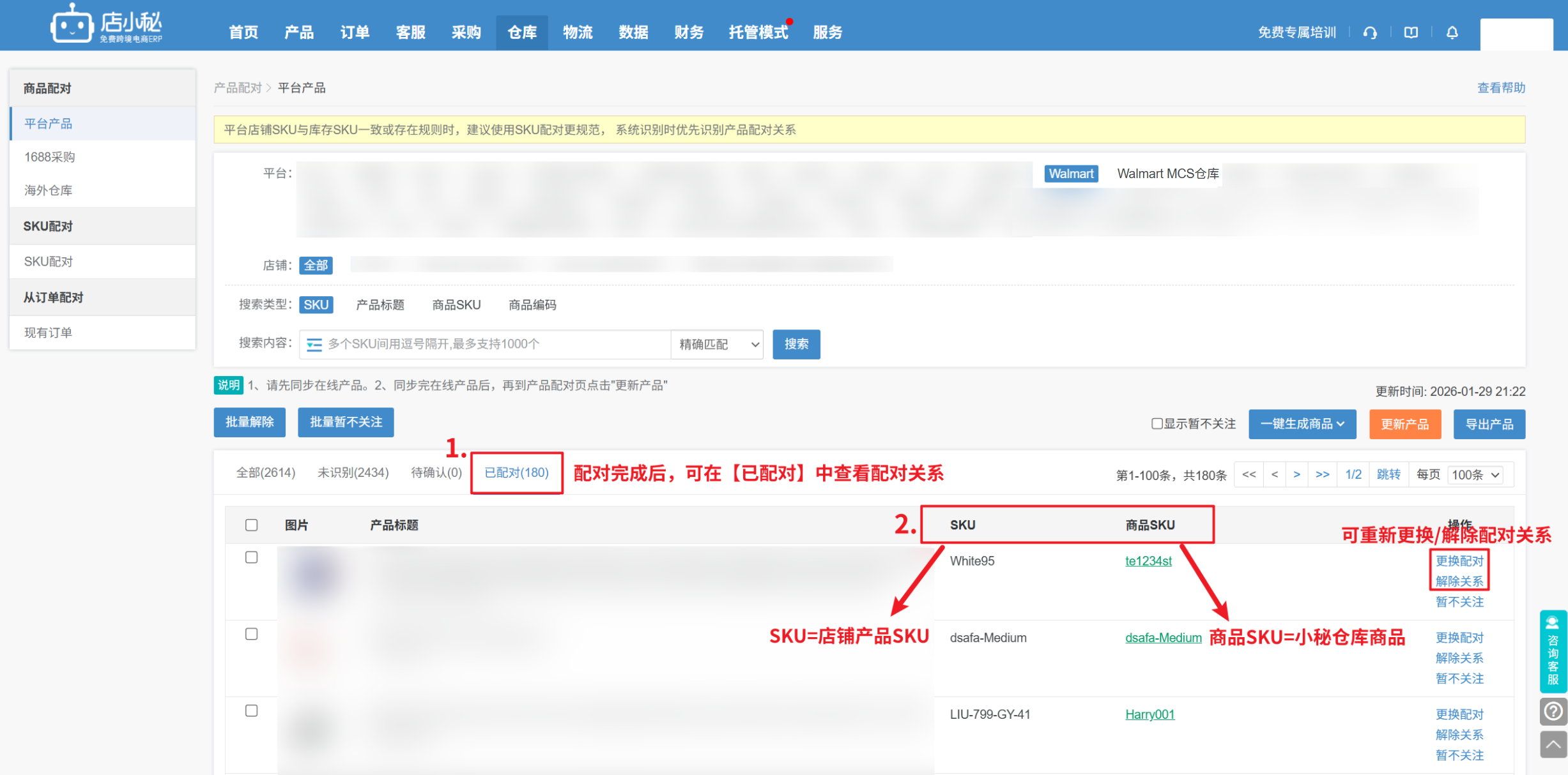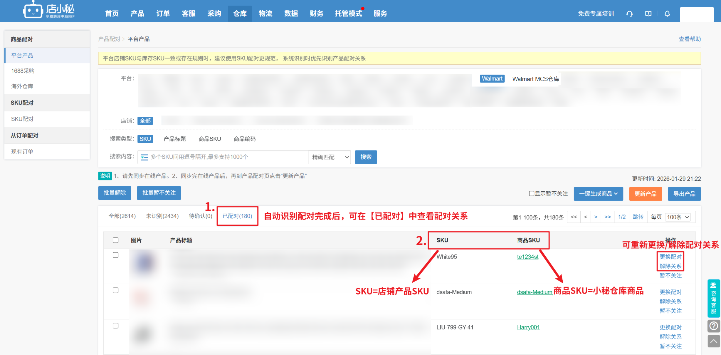 步骤:【仓库—商品配对—平台产品—Walmart—更新产品,将店铺产品SKU同步过来,指定选择和MCS产品SKU配对过的商品SKU完成配对】