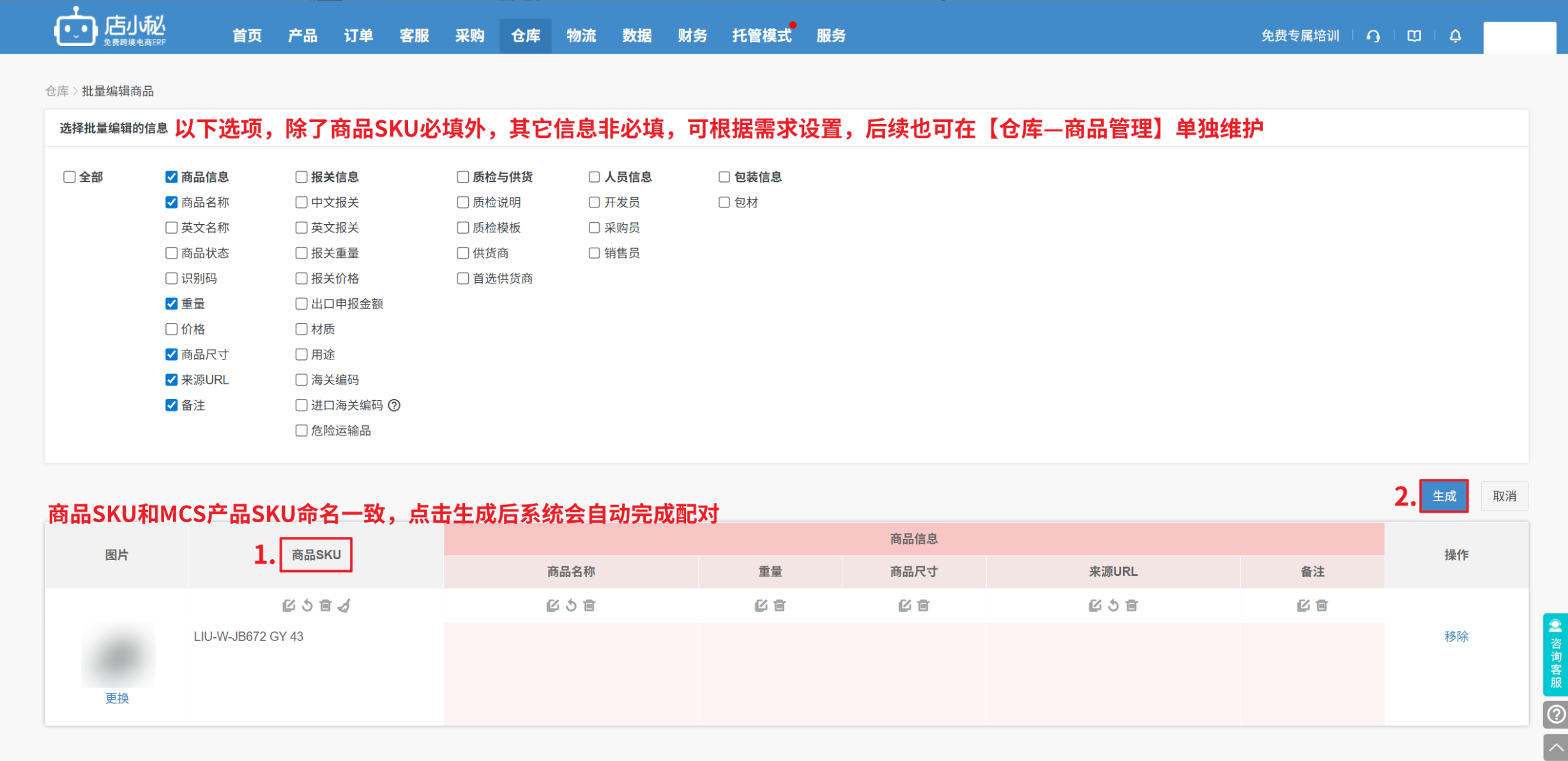 第二种:若之前在【仓库—商品管理】中,没有添加商品SKU,则需要通过一键生成商品,来完成配对