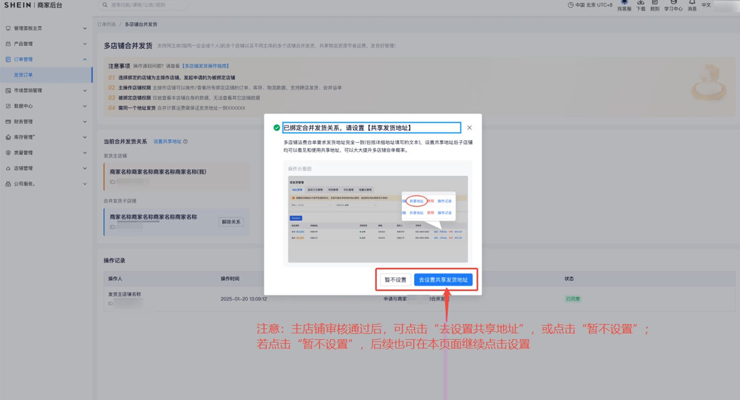 选择共享地址发货后,提交到Shein后台,后台会根据规则自动进行合单操作