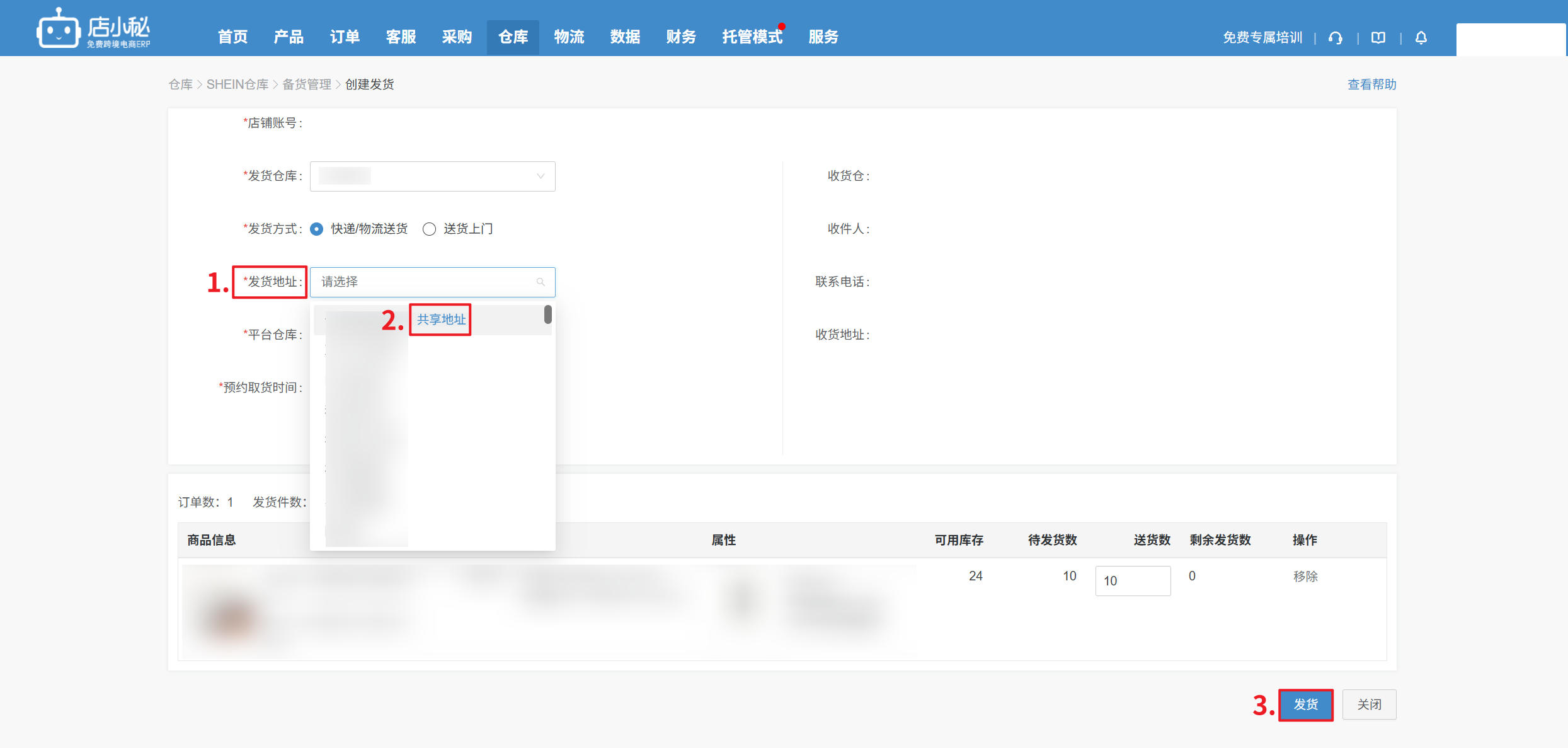 注意:平台接口限制,不支持多个店铺的备货单共同进行发货操作,所以在小秘只需要在发货时查询共享发货地址,