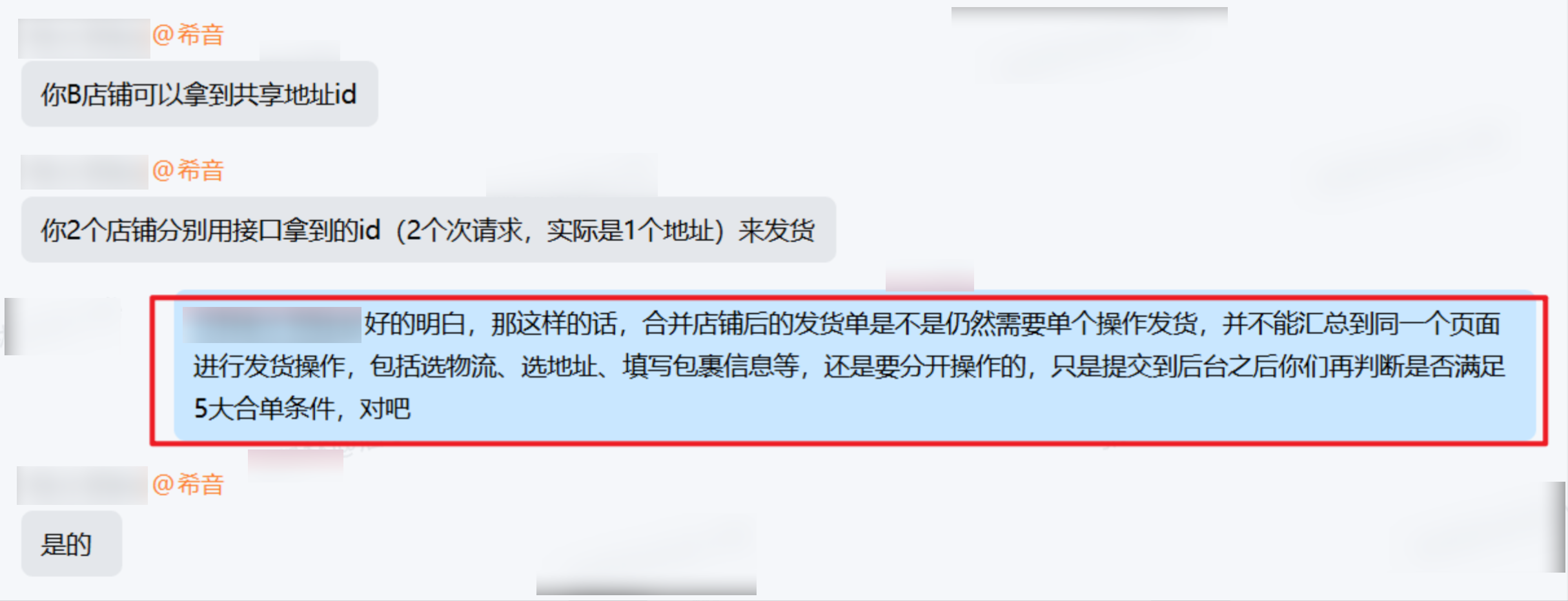 A1:由于平台不支持多个店铺的备货单共同进行发货操作,所以在小秘只需要在发货时查询共享发货地址,