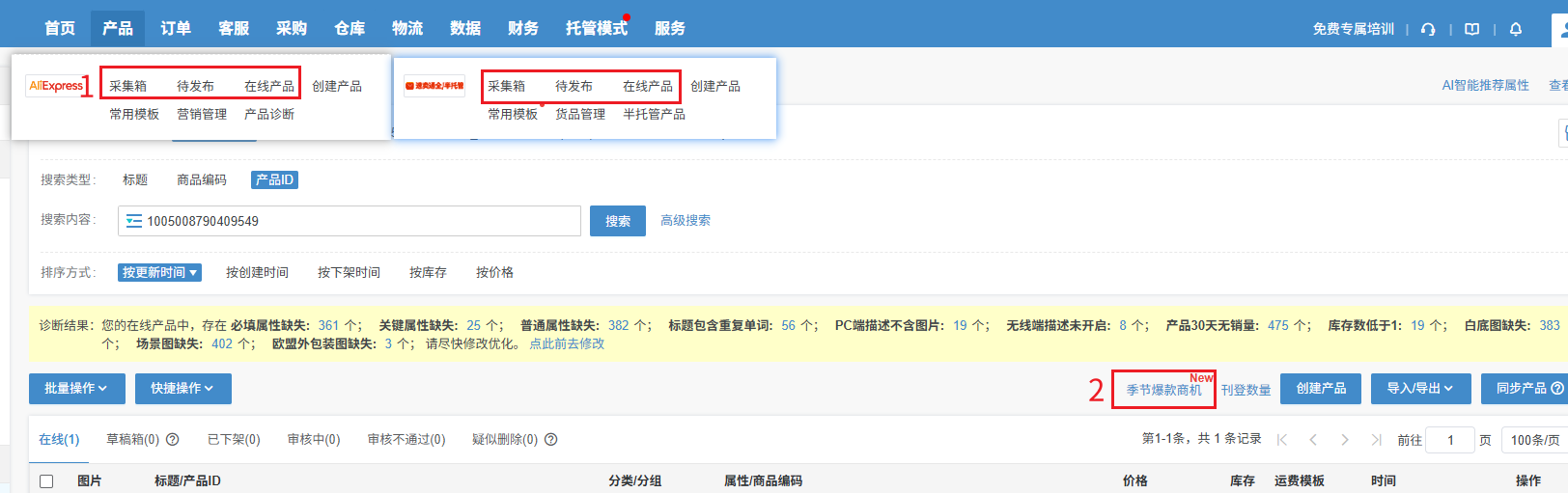 ① 速卖通POP/全托管—采集箱/待发布/在线产品— 季节爆款商机