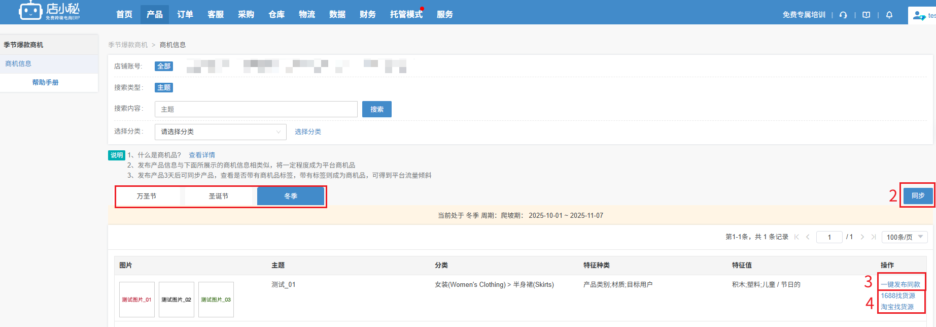 在店小秘可以查看季节爆款商机品,支持一键发布同款,也可通过1688或淘宝找货源查找商品信息, 采集认领发布同款产品