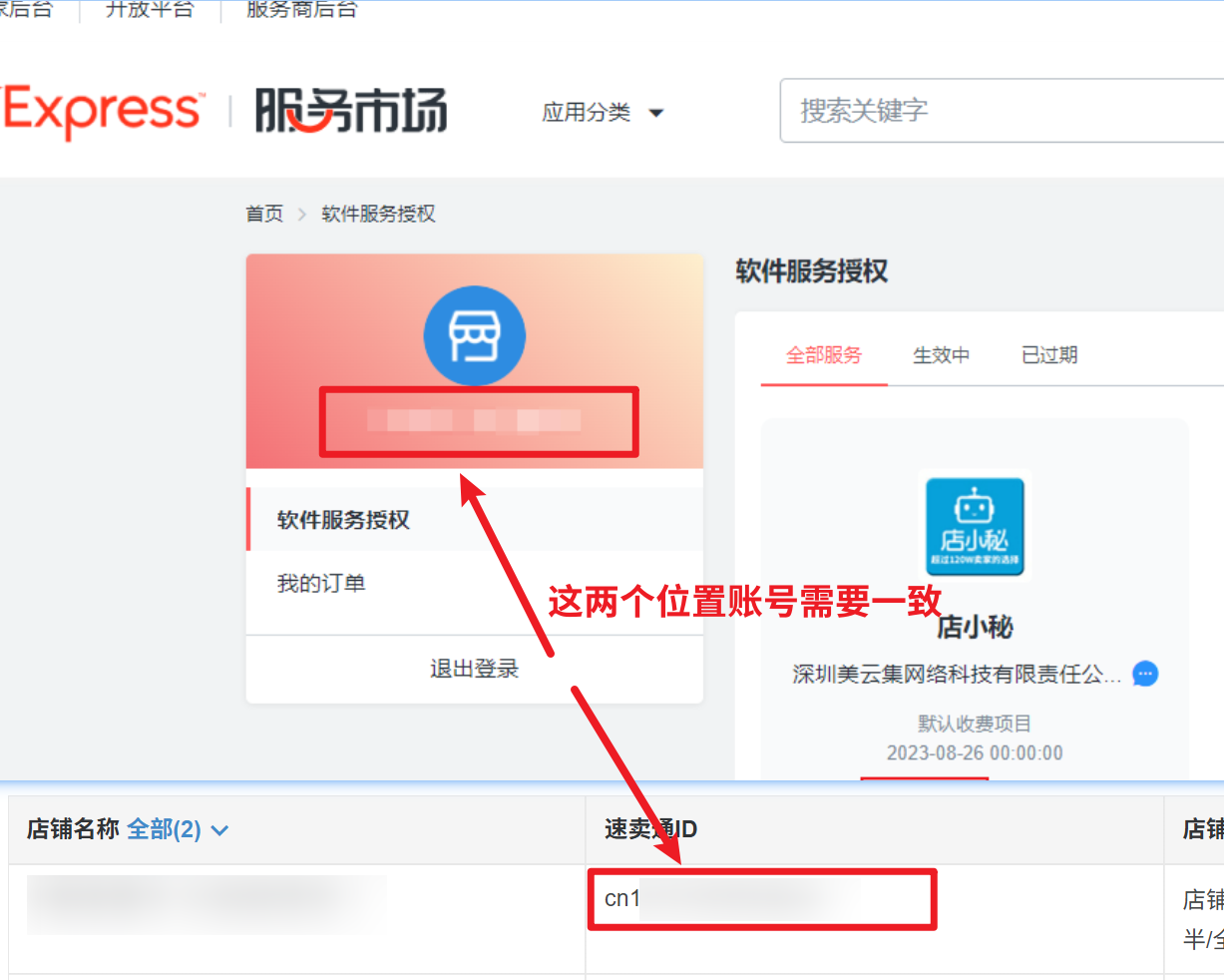 2、请检查购买的市场服务账号和授权异常的账号是否一致,需要切换成授权异常的速卖通账号订购服务