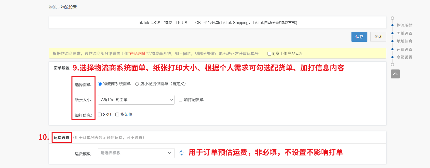 第三步:【选择物流商系统面单、纸张大小—完善物流设置信息—点击保存即可】