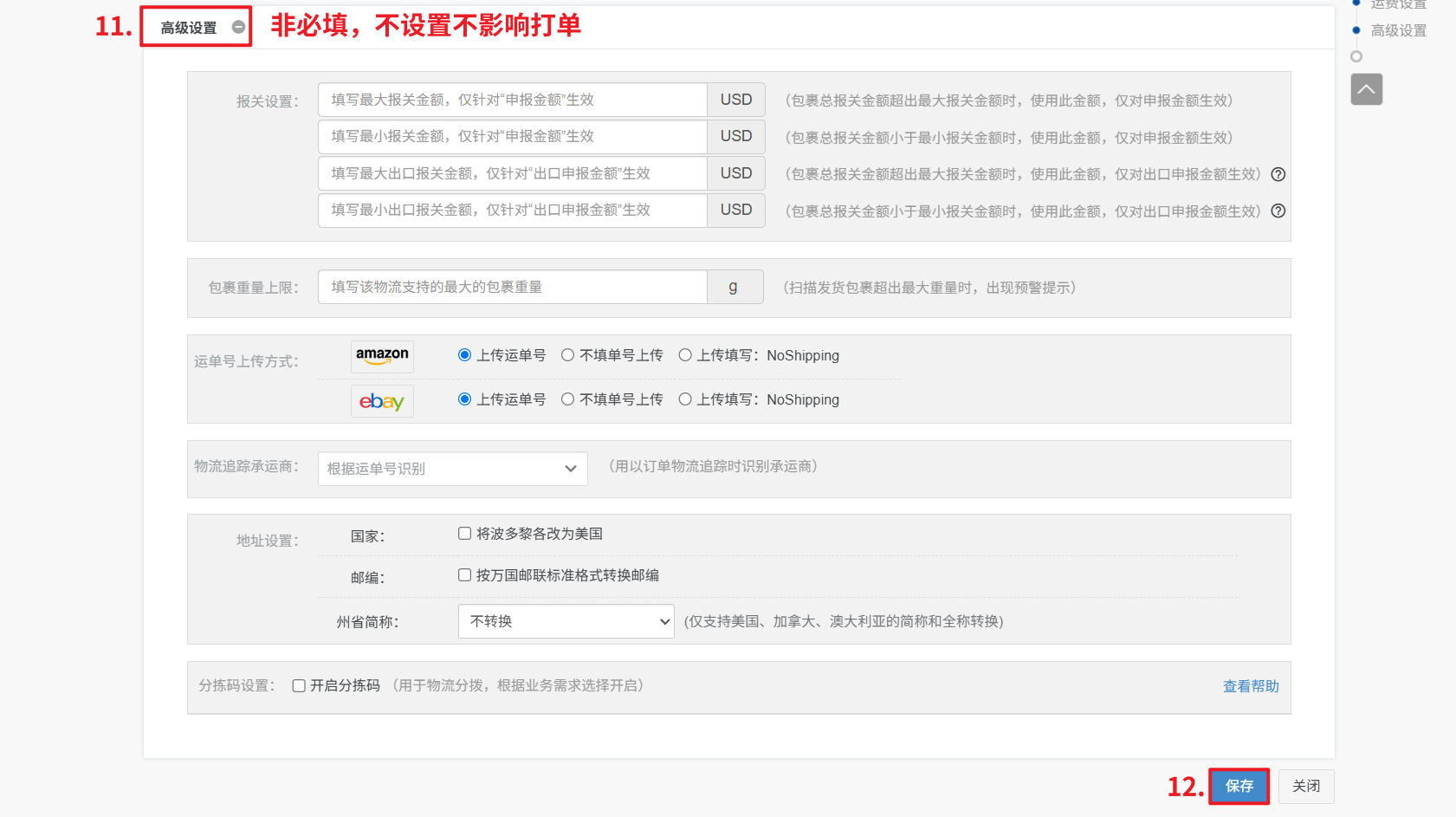 2、填写最大或最小报关金额/出口报关金额后,当您订单报关金额,超过这个最大报关金额后,以填写的最大报关金额向物流商提交