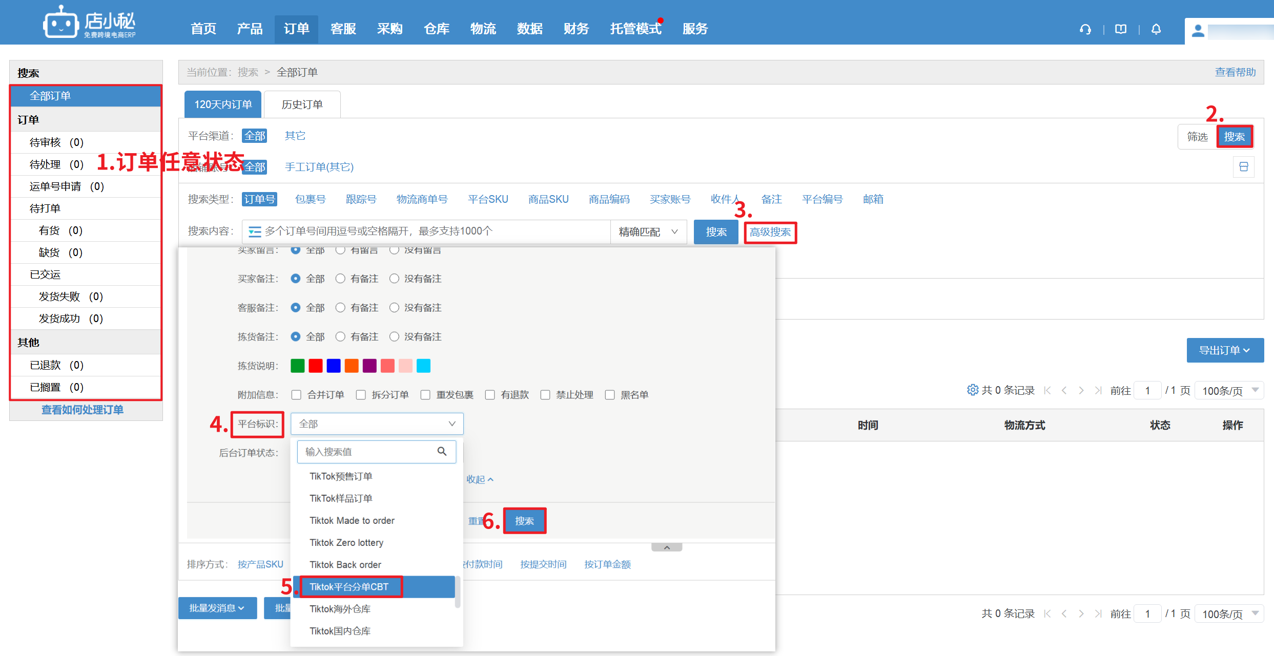 【订单任意状态—搜索—高级搜索—平台标识—下拉选择“TikTok 平台分单CBT”—确定】