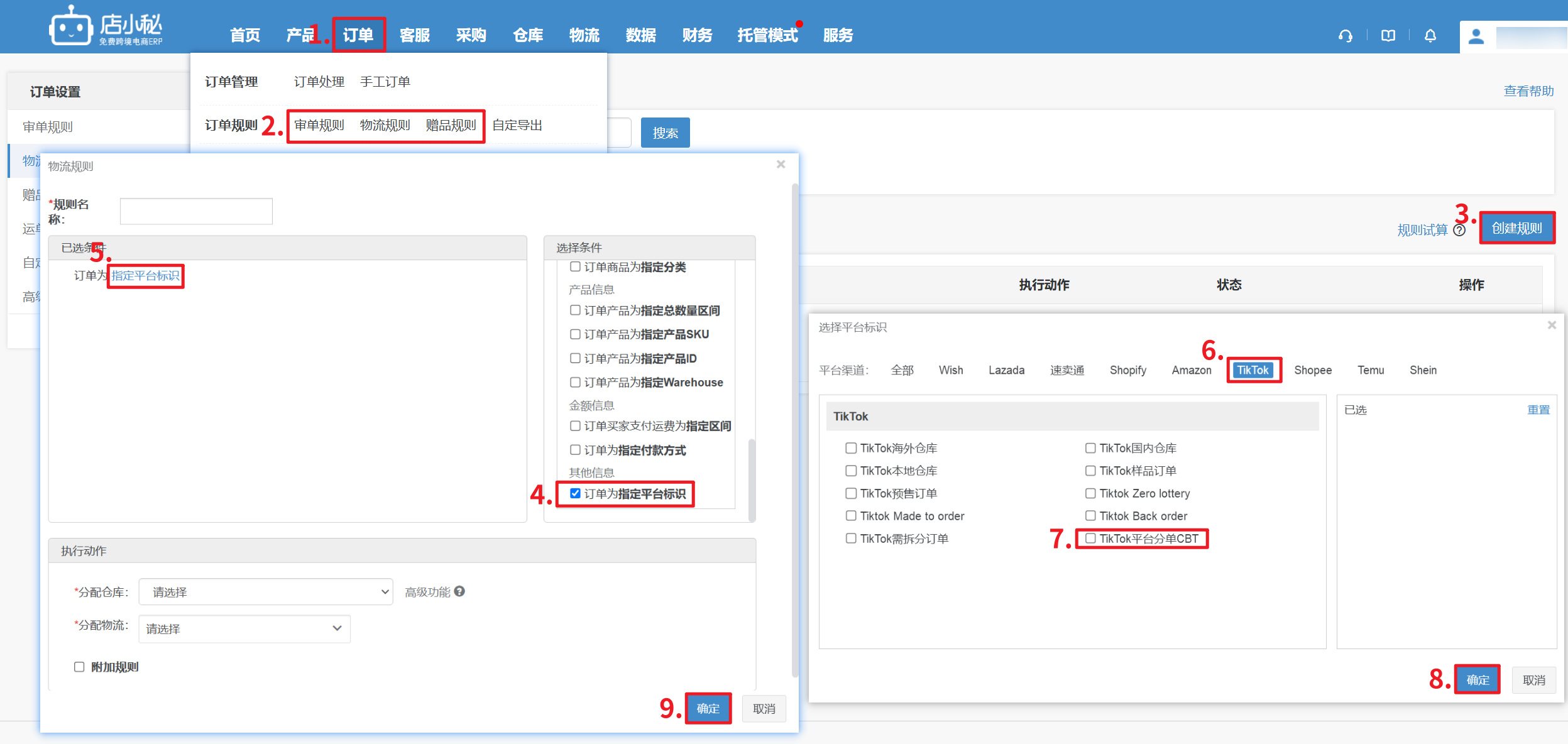 【订单—审单/物流/赠品规则—创建规则—勾选指定平台标识—点击蓝色字体—选择TikTok平台—勾选“TikTok 平台分单CBT”—确定】