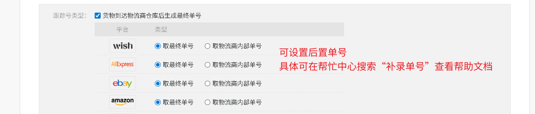【补录单号】:部分物流渠道,需要生成一个中转单号和面单将货物寄到物流商仓库,才会生成最终的物流单号;