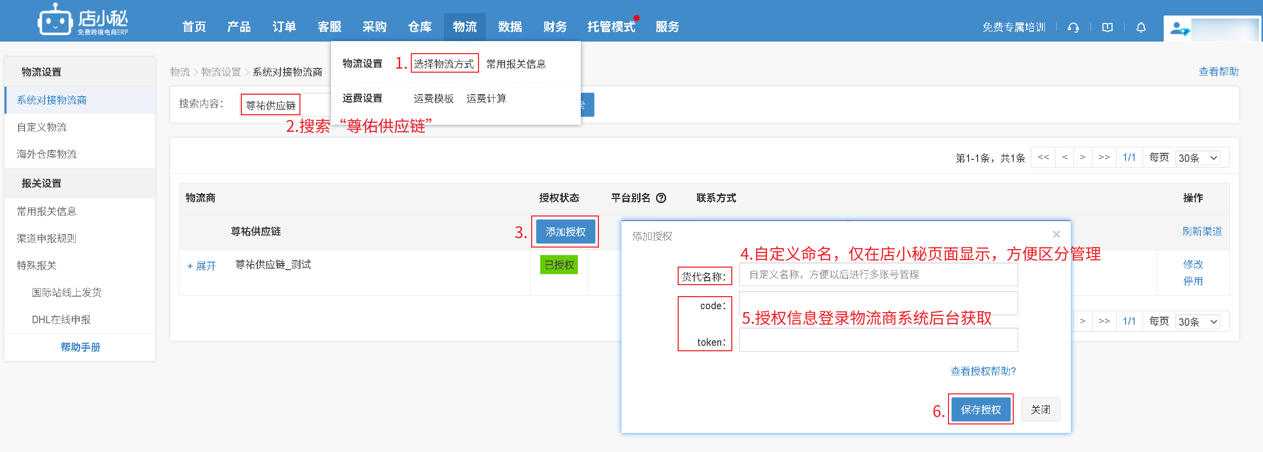 第一步:【物流—选择物流方式—搜索“尊祐供应链”—添加授权—自定义物流商名称—登录物流商系统后台获取授权信息填写—保存授权】