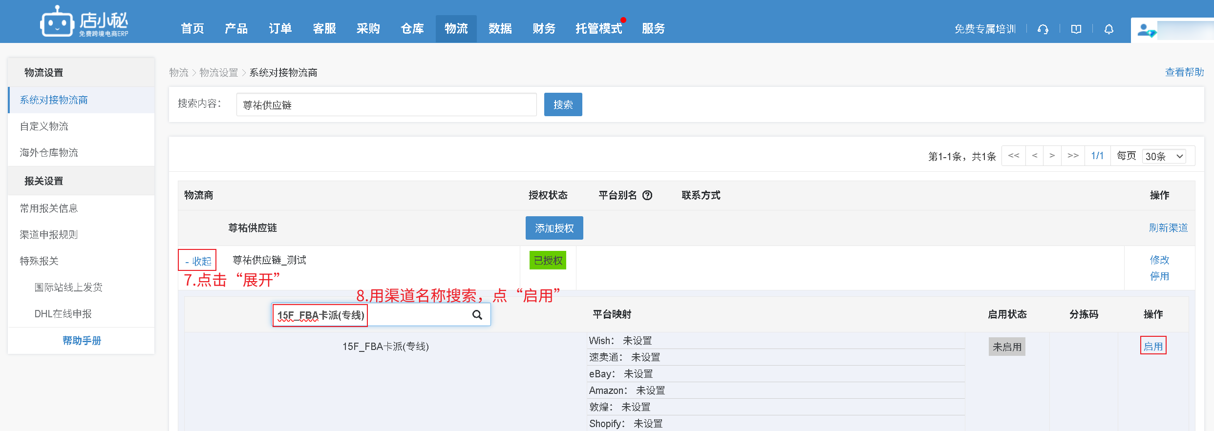 确认清楚后,在店小秘搜索这个渠道的名称,点启用,处理订单就可以选择“已启用”的渠道申请运单号。