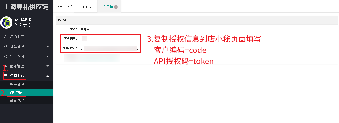 注意:登录物流商系统后台http://shzy.t6soft.com/点“客户登录”,输入物流商给的账号和密码,【管理中心-API申请】授权信息复制粘贴到小秘页面填写