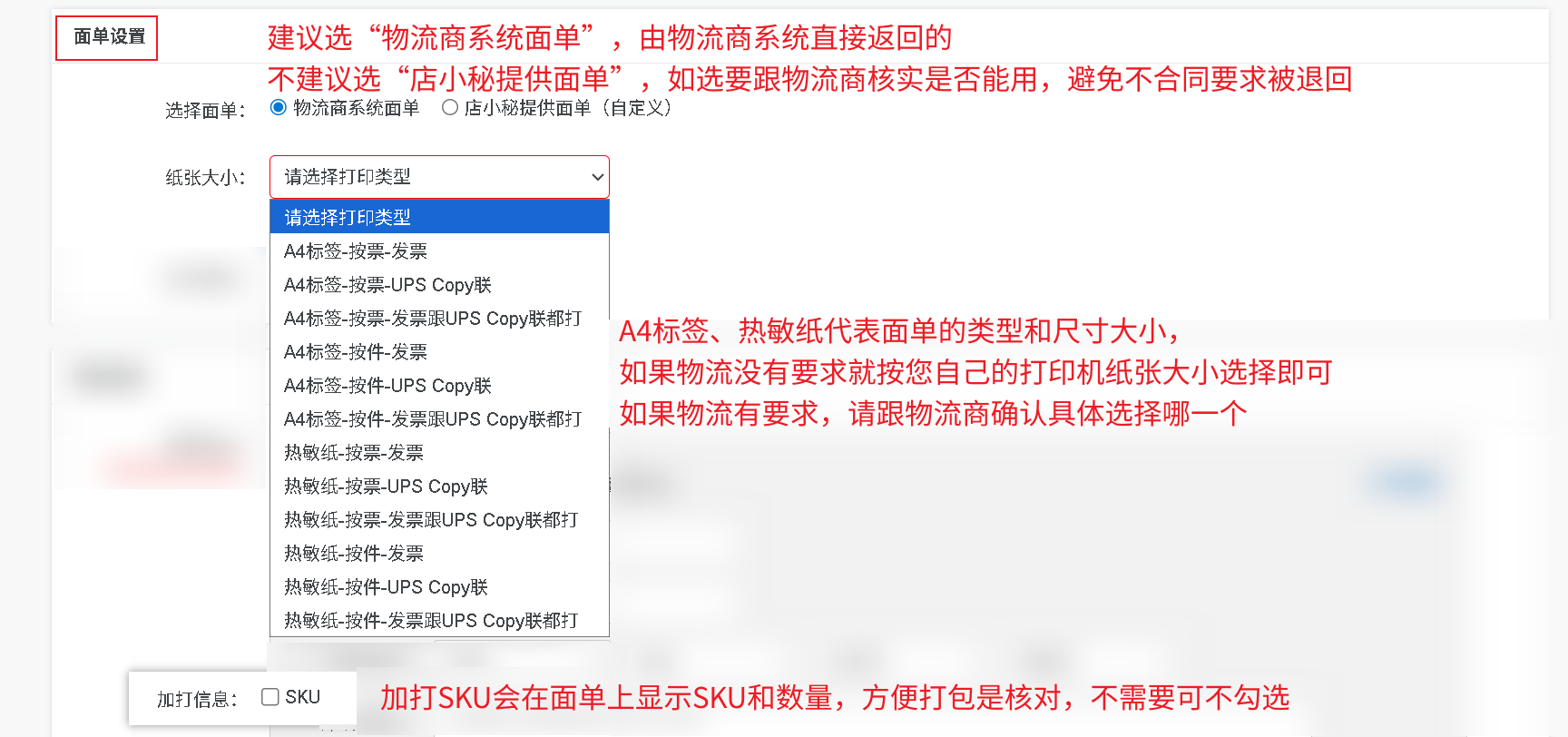 选择面单:请选“物流商系统面单”,由物流商系统直接返回的,不建议选“店小秘提供面单”,如选要跟物流核实是否能用,避免