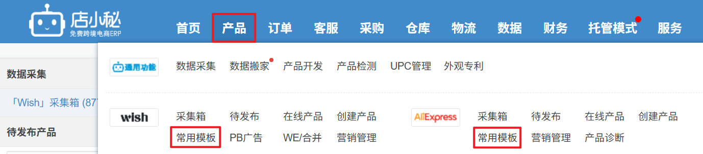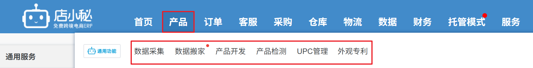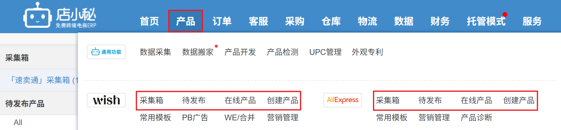 数据采集、数据搬家、导入产品、引用产品、复制为新产品、1688跨境铺货、一键发布、产品开发、创建产品、