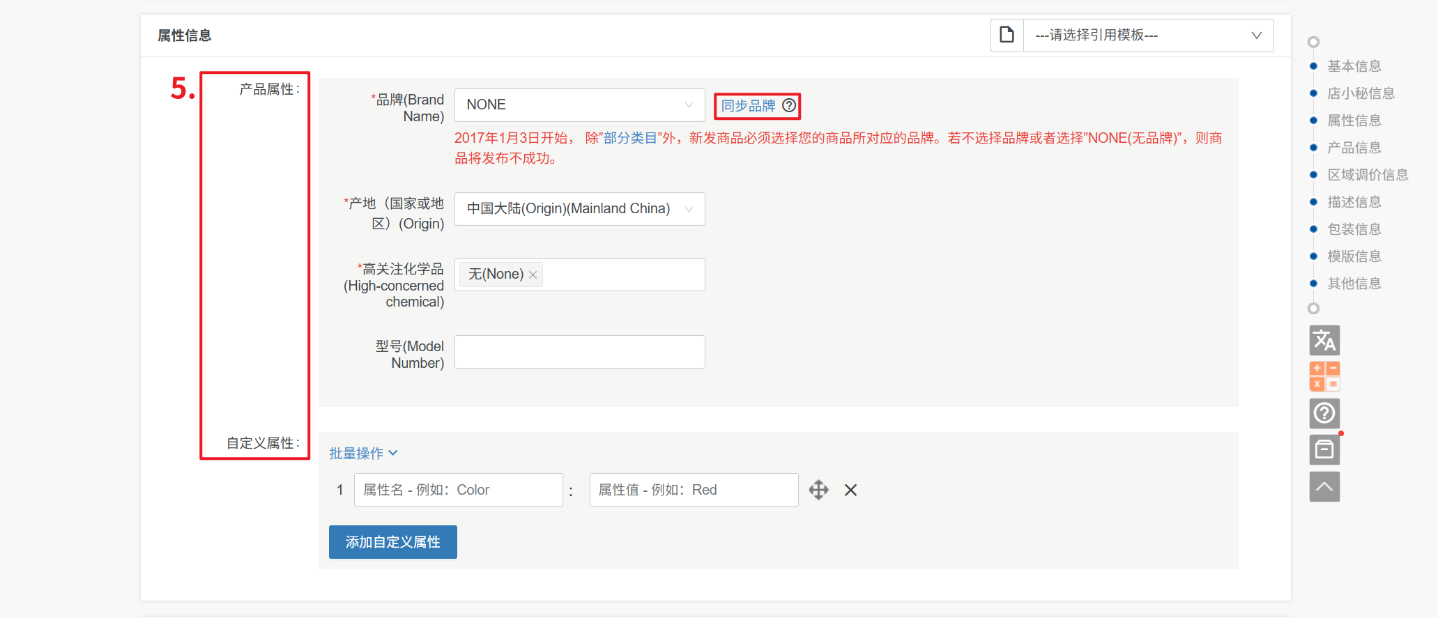 ① 产品属性:不同的产品分类,产品属性不一样,根据实际产品选择即可,带*号必填