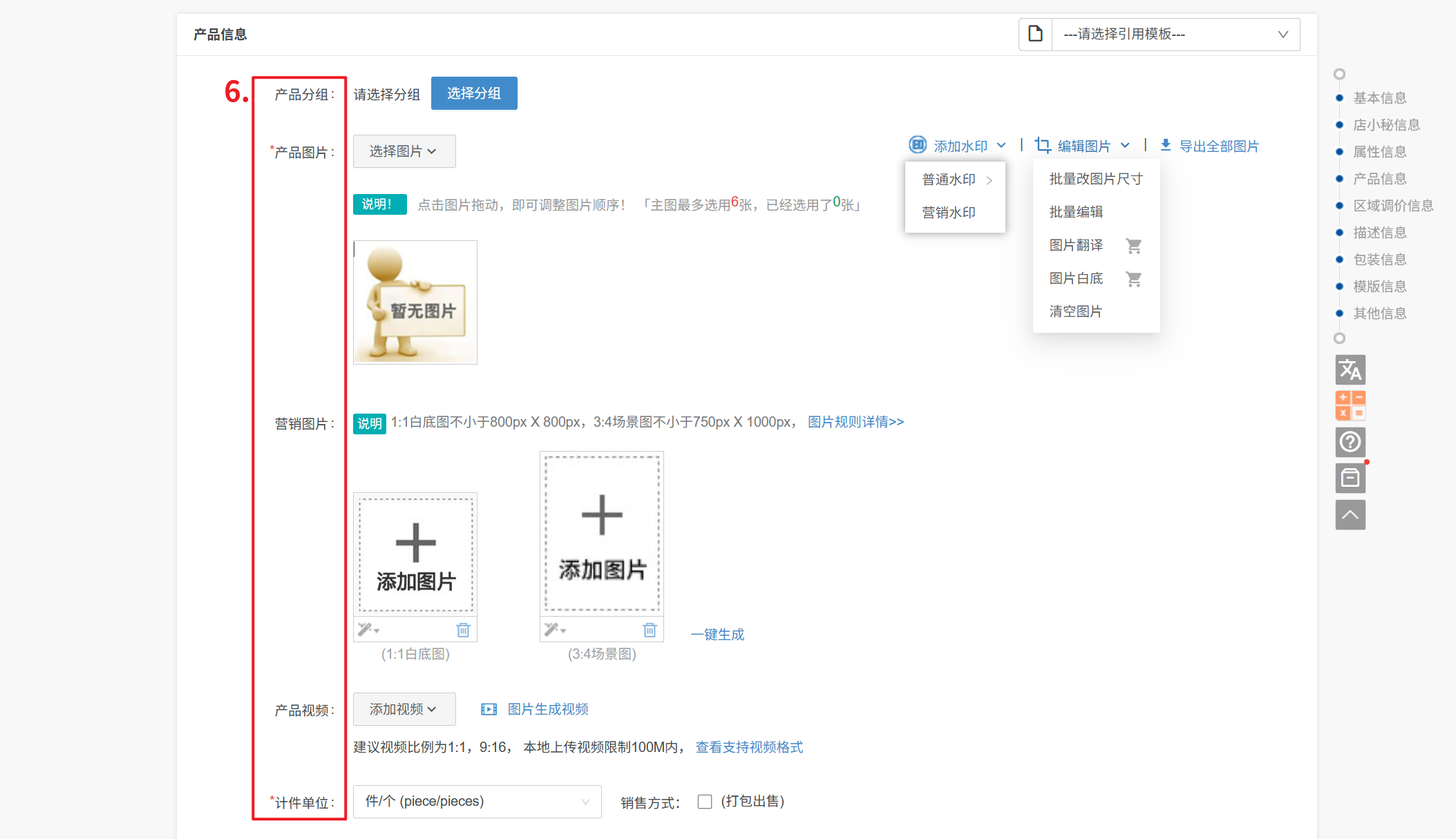 ④ 产品视频:1、仅支持单个编辑页上传,建议视频比例为1:1或9:16;本地上传视频限制100M内;