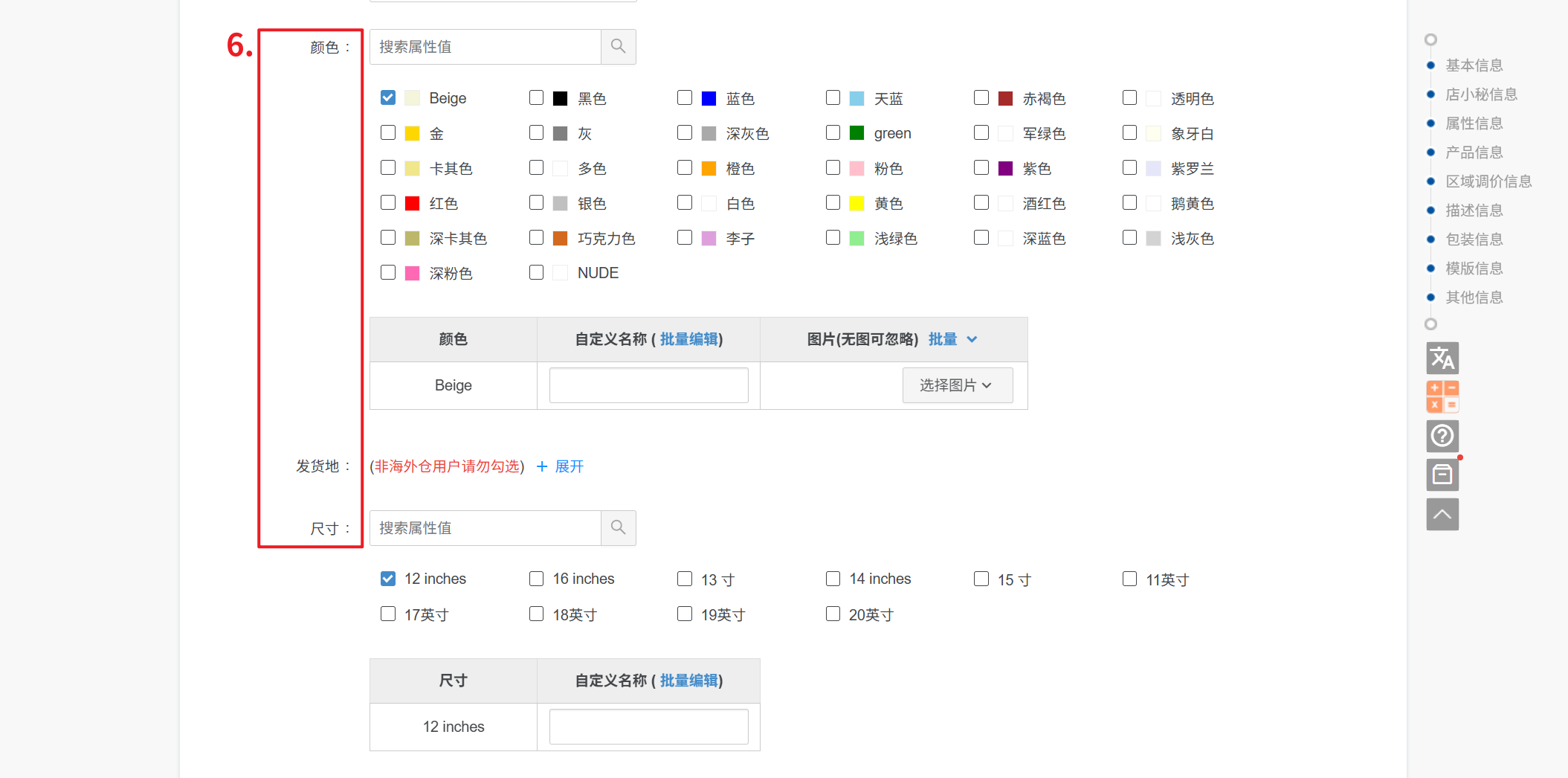 ⑥ 颜色/尺寸:勾选颜色、尺寸等变种规格,不同的产品分类,变种主题展示会不一样,根据产品实际情况勾选,带*号必填