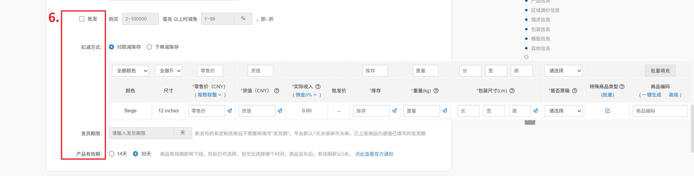 库存:针对不同变种填写产品库存,带*号必填