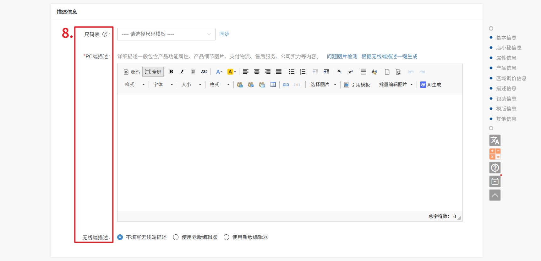 ② PC端描述:PC端访问产品时,展示的描述信息,支持上传文字图片等信息,不能超出10W个字符