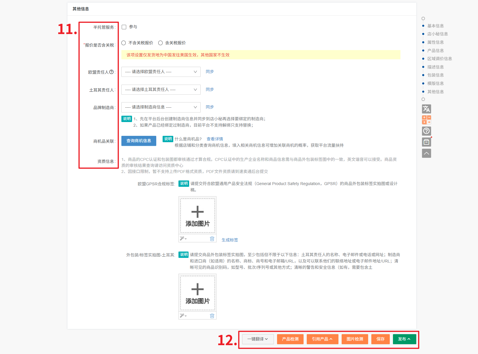 ③ 海关监管属性:根据产品实际情况如实填写海关描述信息,决定产品关税比例是多少