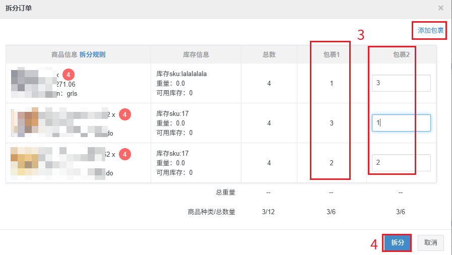 若是需要拆分成3个包裹,可点击添加包裹