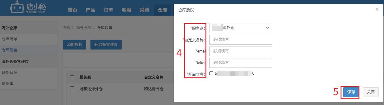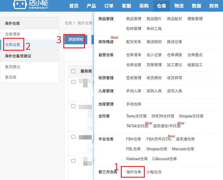 第一步:【仓库—海外仓库—仓库设置—添加授权—选择海外仓—勾选仓库—保存—完成授权】