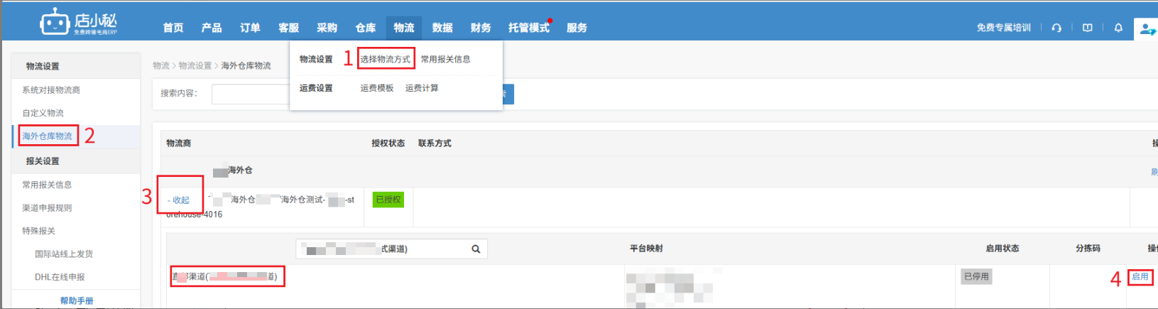 第二步:【物流—选择物流方式—海外仓物流—找到具体海外仓—展开—选择对应的海外仓物流渠道并启用—完善物流设置—保存】