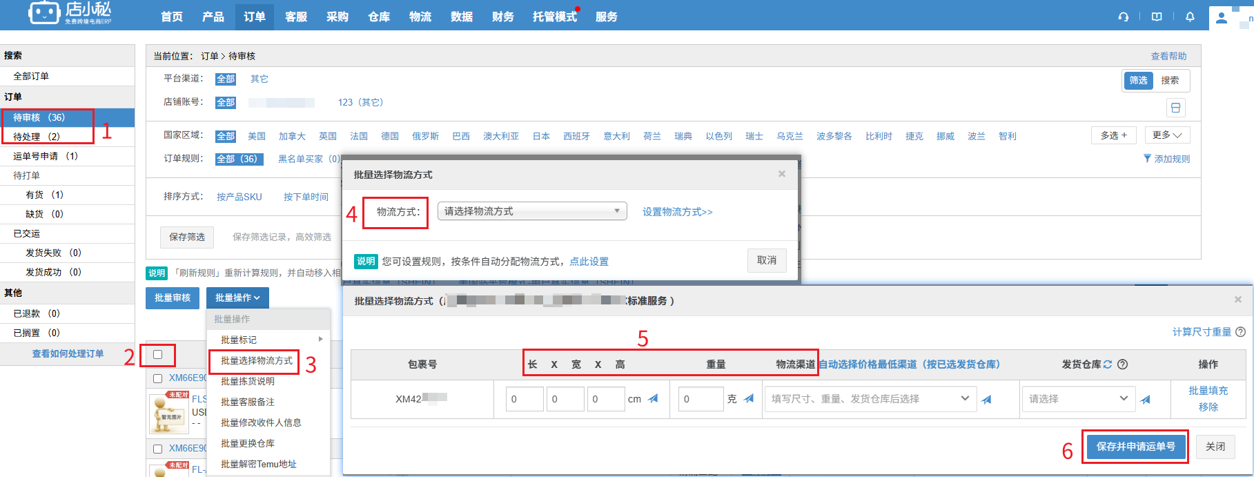 ② 【待审核/待处理订单状态—勾选订单—批量选择物流方式 —选择海外仓渠道— 填写尺寸重量—选择具体的物流渠道—保存并申请单号即可】