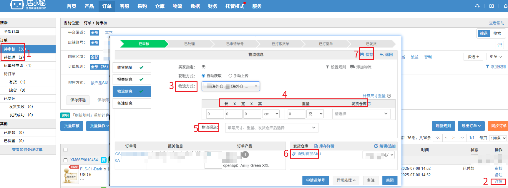 ① 【待审核/待处理订单状态—订单详情—物流方式—右上角编辑—选择海外仓渠道— 填写尺寸重量—选择具体的物流渠道—保存】