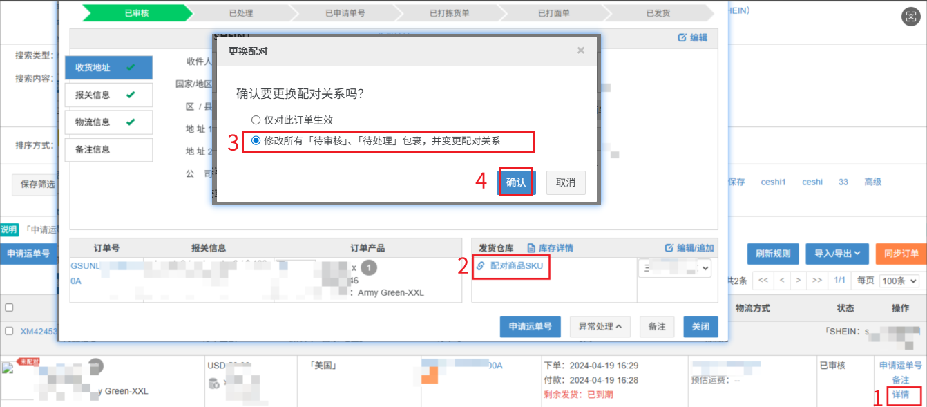 ① 【点订单详情—配对商品SKU—选择与海外仓SKU配对的商品SKU—选择(修改所有待审核待处理包裹,并变更配对关系)】,若订单已经配对可忽略这一步