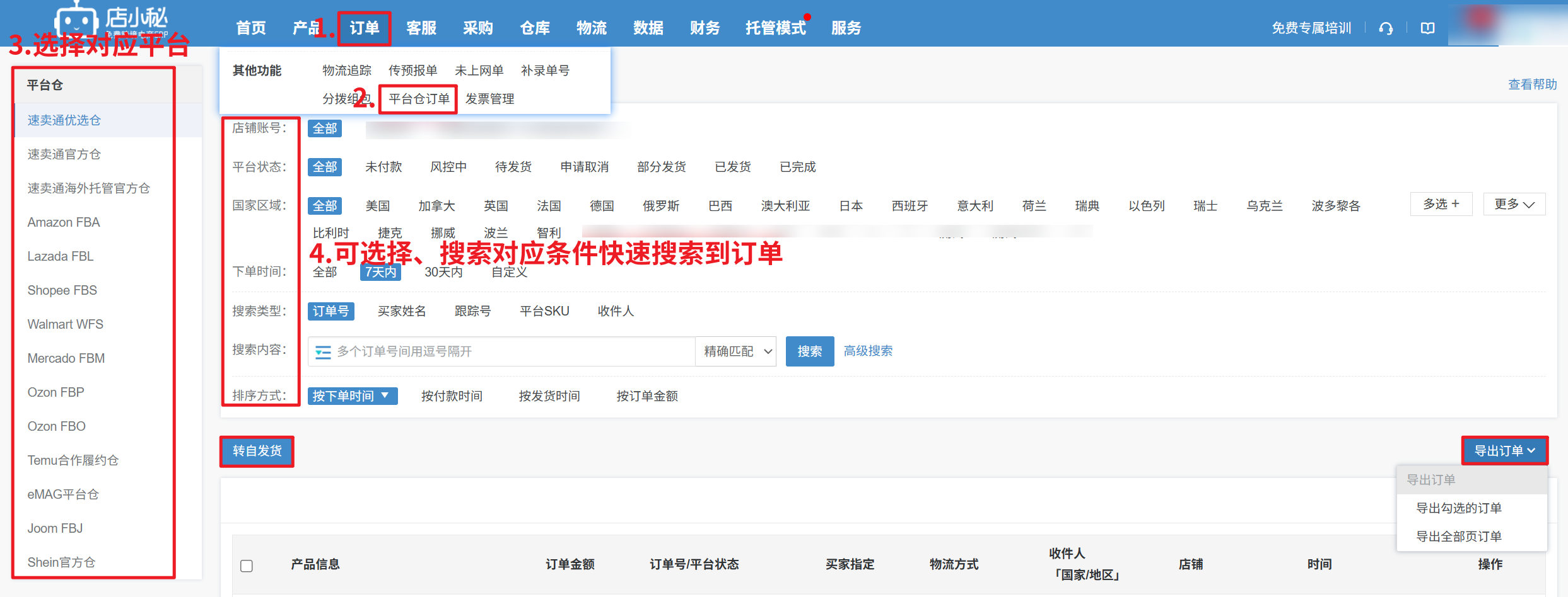 【订单—平台仓订单—选择对应平台仓库,比如 速卖通优选仓 —可勾选订单,转自发货/导出 即可】