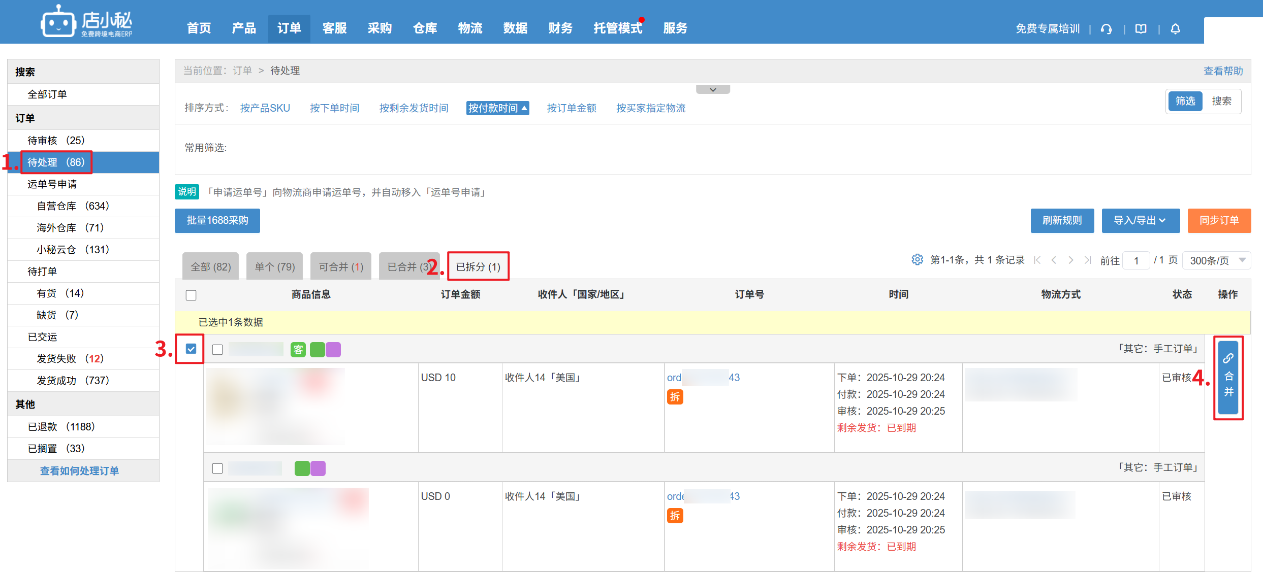 A1:拆分后,发现拆分错误,可在待处理的【已拆分】里合并订单后,再重新拆分