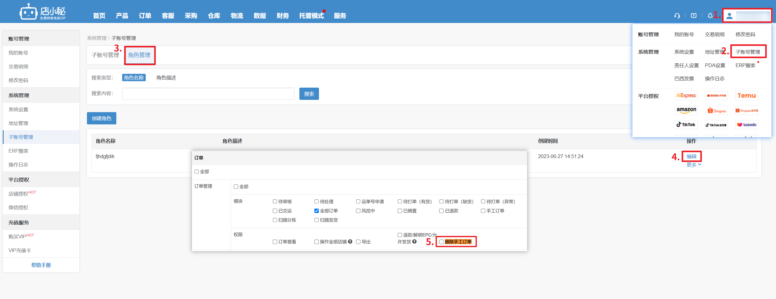 【4】子账号需要主账号登录右上角用户名—子账号管理—角色管理编辑—订单管理权限—勾选删除手工订单才可操作