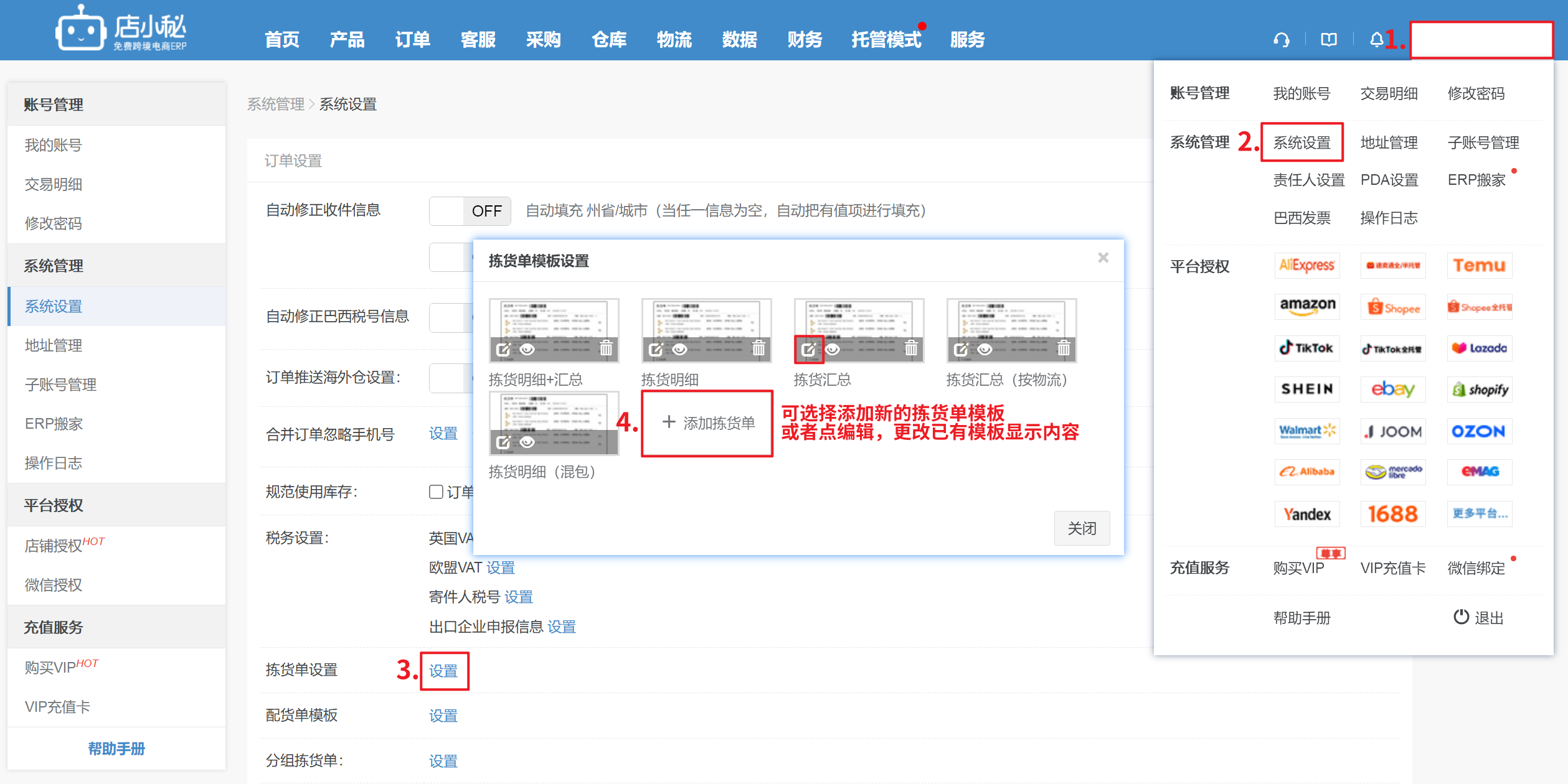 【登录小秘主账号—用户名—系统设置—拣货单设置—编辑/添加拣货单—自定义模板内容—保存】