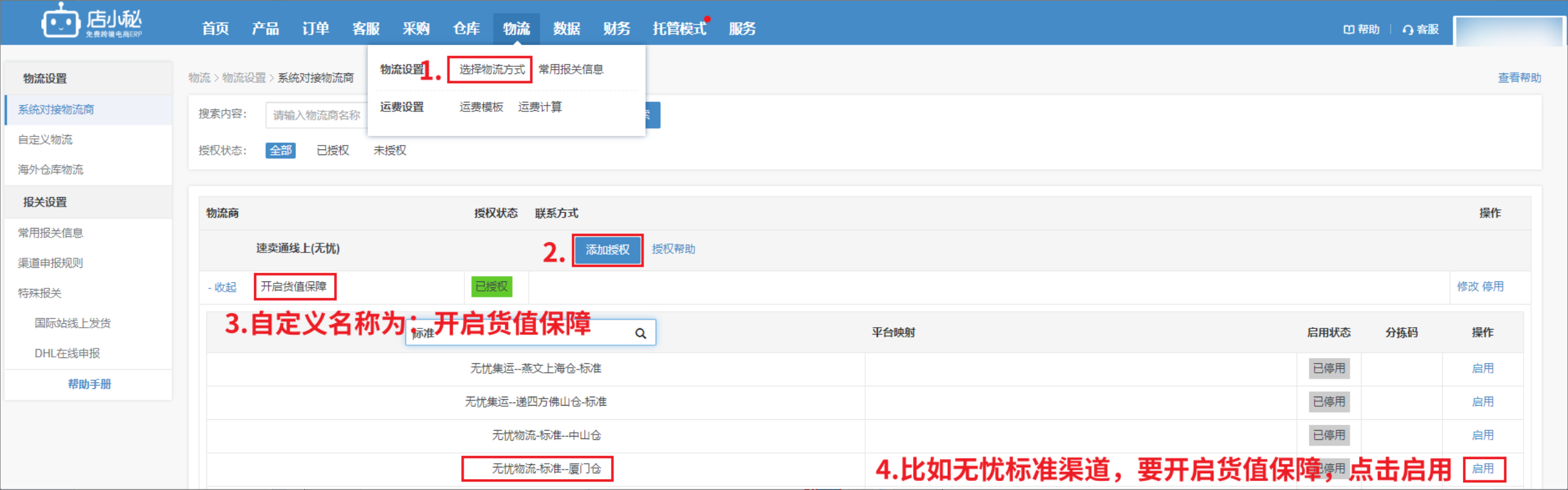 【物流—选择物流方式—速卖通线上—添加授权—定义名称:开启货值保障—启用渠道—开启货值保障并设置条件】