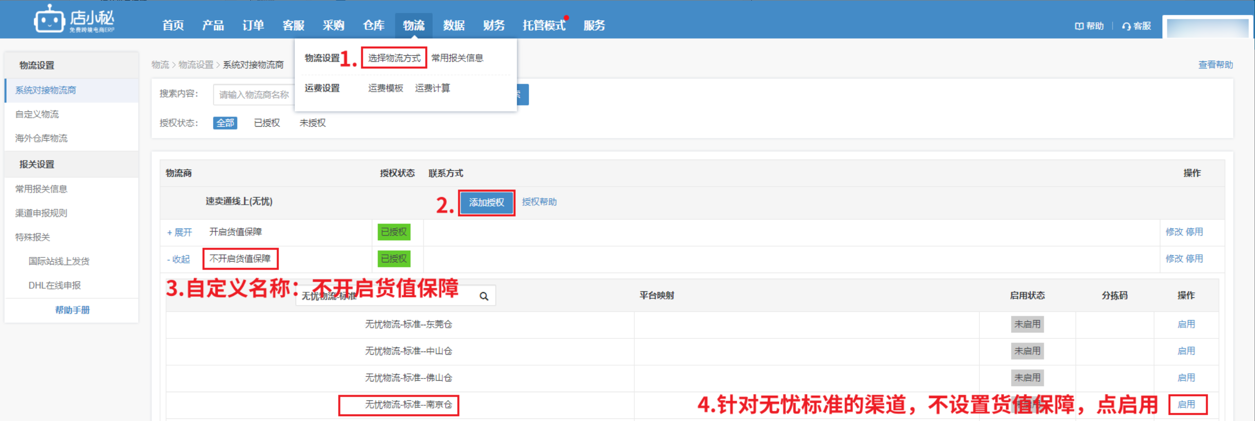 【物流—选择物流方式—速卖通线上—添加授权—定义名称:不开启货值保障—启用渠道—不开启货值保障】